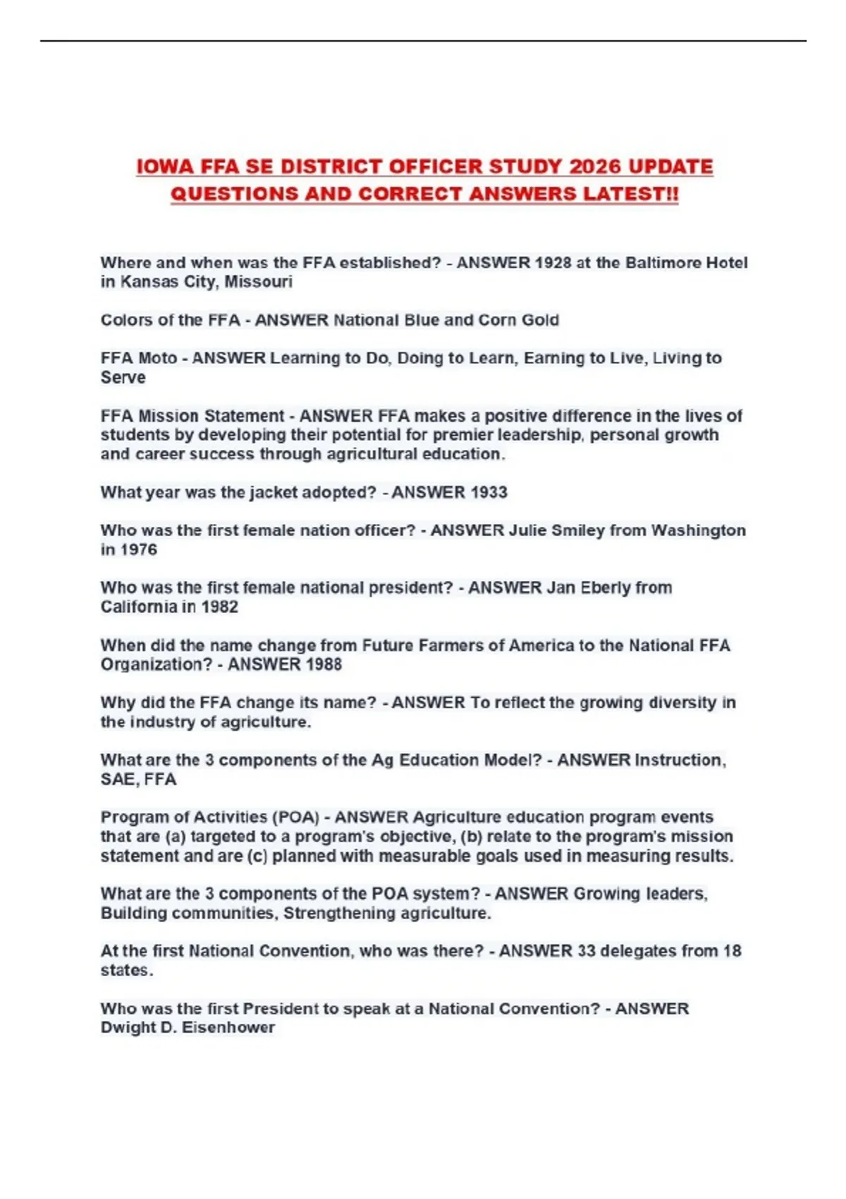 IOWA FFA SE DISTRICT OFFICER STUDY 2026 UPDATE QUESTIONS AND CORRECT ANSWERS LATEST!!...