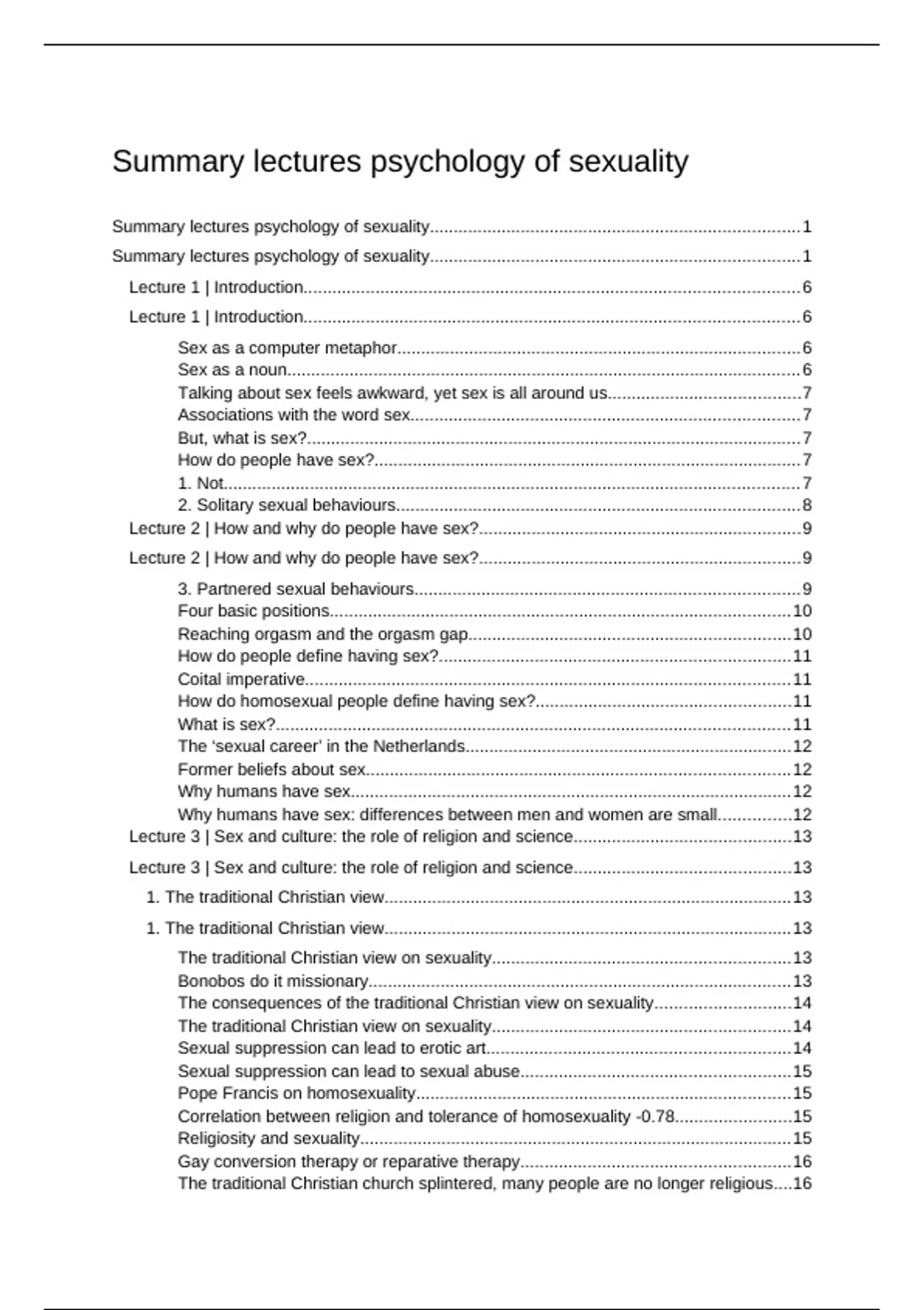 This is a transcript or a clear and detailed summary of all the 12 lectures of the Psychology of Sexuality course taught by Maerten Prins. I got a 9 for the exam using this summary. It contains all the information said in the lectures and lecture slides and is written in the same order and with the same headings as in the lecture slides.