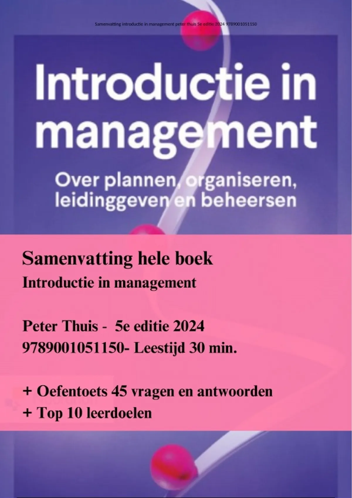 ,Samenvatting introductie in management peter thuis 5e editie 2024 9789001051150