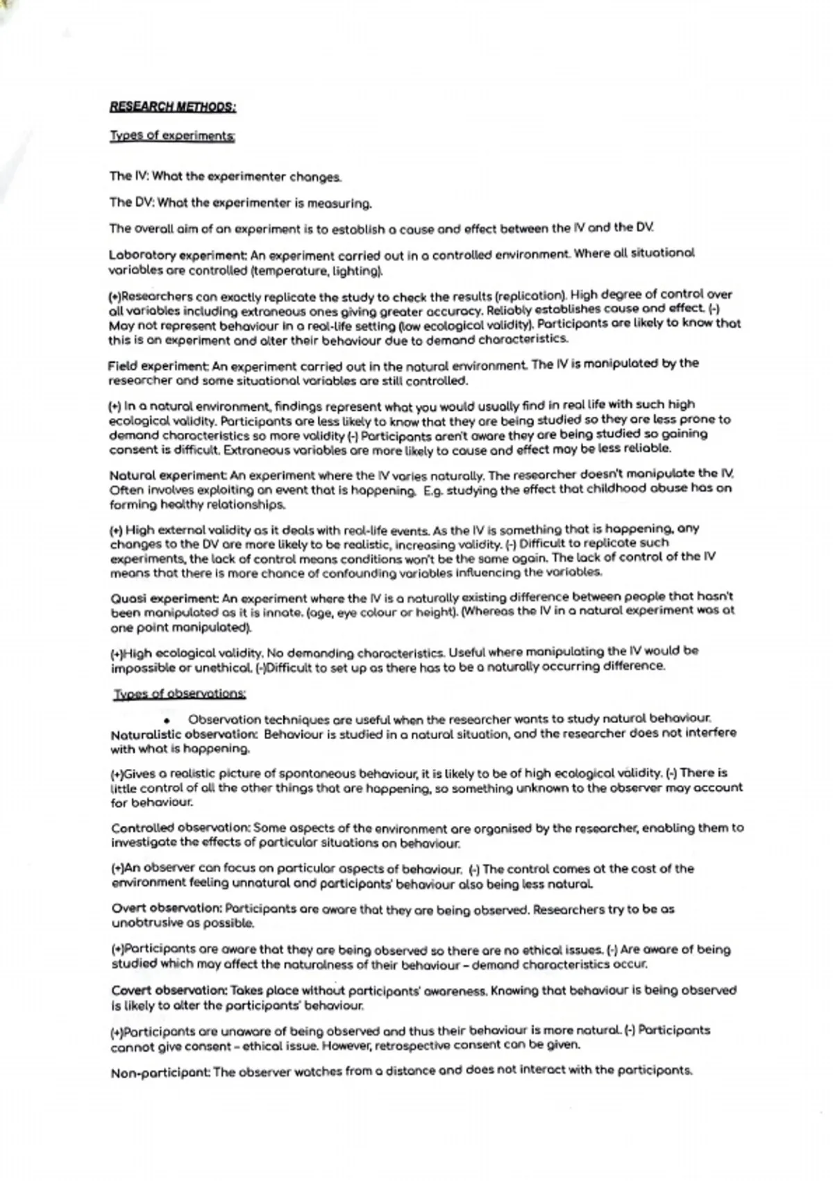 Summary A-level psychology research methods
