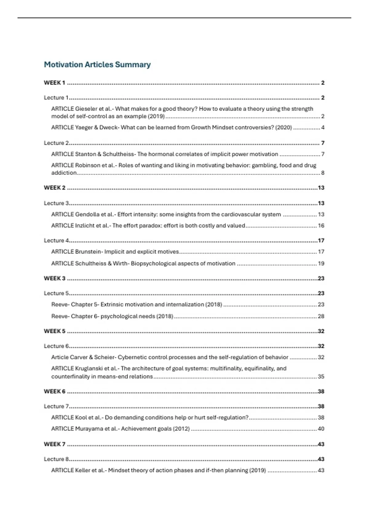 Summary of all the articles that are exam material for the course "Motivation", as part of the Social Psychology specialization/ Social Influence minor.