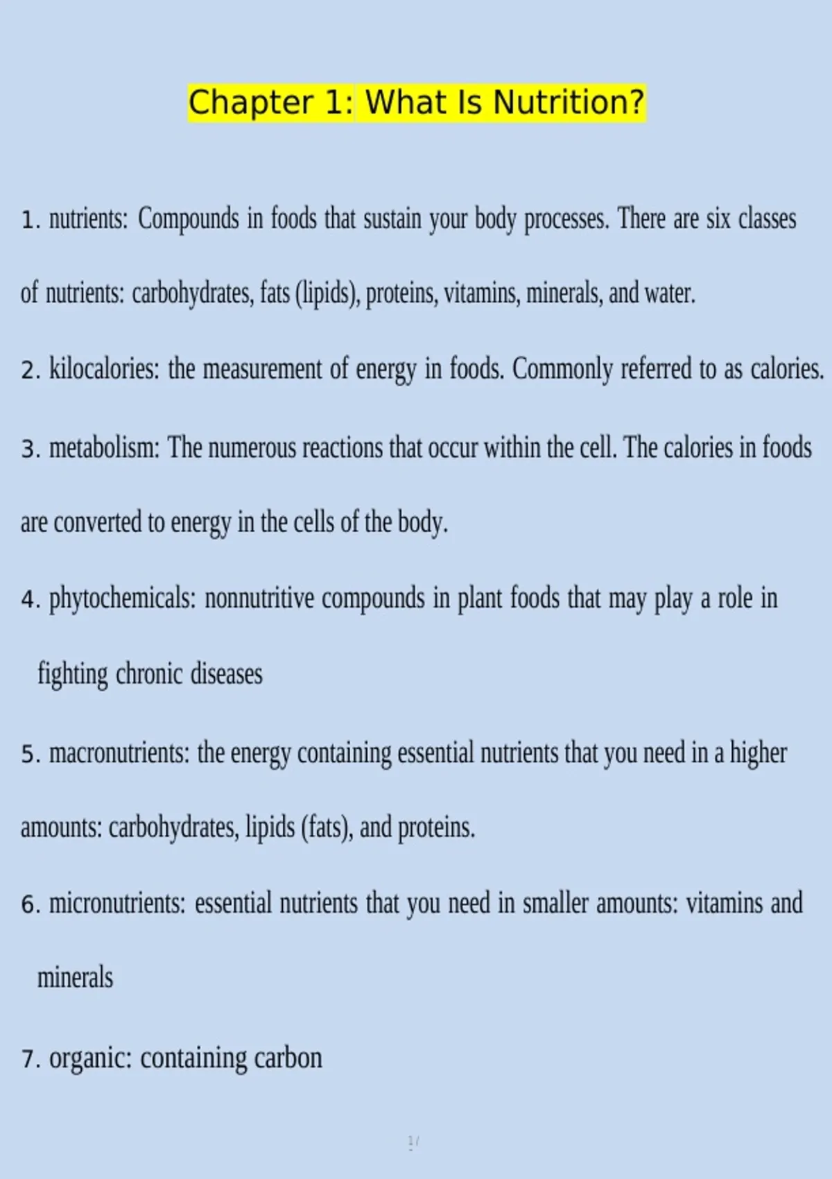 1. nutrients: Compounds in foods that sustain your body processes. There are six classes