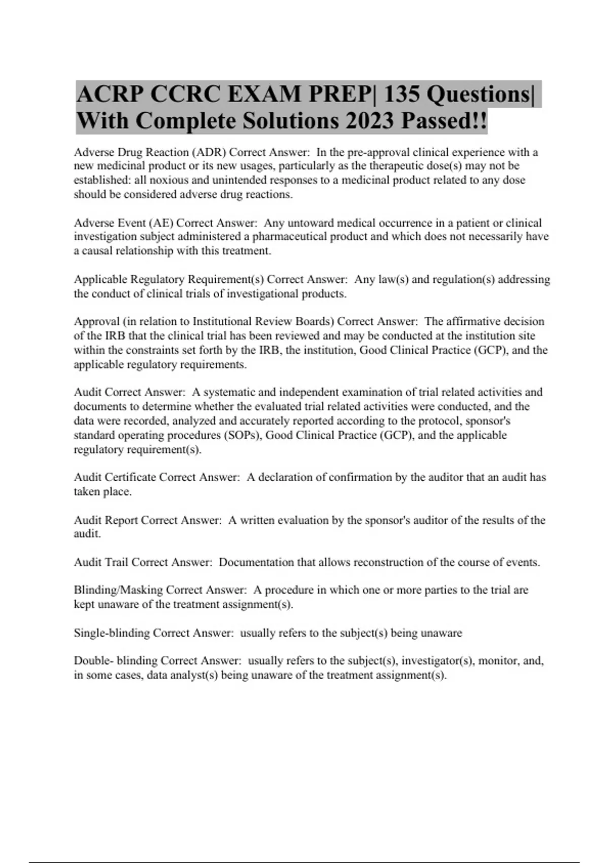 Clinical Trial/Study Report Correct Answer: A written description of a trial/study of any