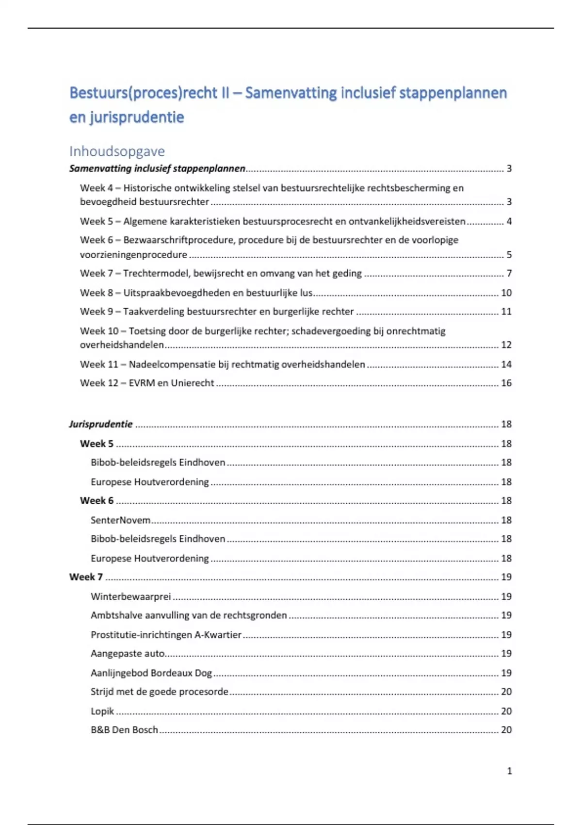 Dit document bevat een zeer uitgebreide samenvatting van de stof voor het vak bestuurs(proces)recht II. Het document is inclusief relevante artikelen, stappenplannen én verwijzingen naar en volledige uitwerkingen van de verplicht voorgeschreven arresten. Eigen eindcijfer voor dit vak: 9.5 Let op: dit document is geschreven in het kader van de bachelor European Law School en bevat daarom NIET de stof en jurisprudentie over het onderwerp 'bestuurlijk handhavingsrecht' uit de eerste drie weken (dit onderwerp was voor European Law School studenten uitgezonderd)