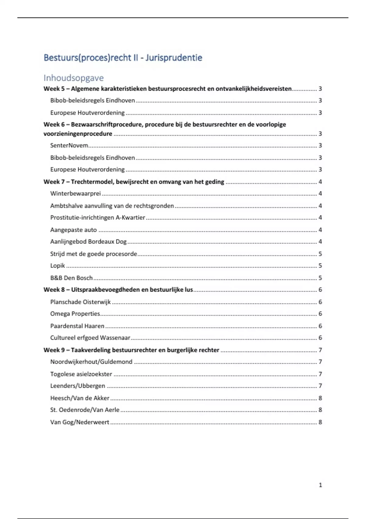 Dit document bevat de verplicht voorgeschreven jurisprudentie voor het voor het vak Bestuurs(proces)recht II. De uitwerking omvat minimaal de rechtsregel, maar waar nodig ook uitgebreidere informatie (denk aan relevante rechtsoverwegingen of een schets van waar de zaak over ging). Eigen eindcijfer voor dit vak: 9.5 Let op: dit document is geschreven in het kader van de bachelor European Law School en bevat daarom NIET de arresten die horen bij het onderwerp 'bestuurlijk handhavingsrecht' uit de eerste drie weken (dit onderwerp was voor European Law School studenten uitgezonderd)