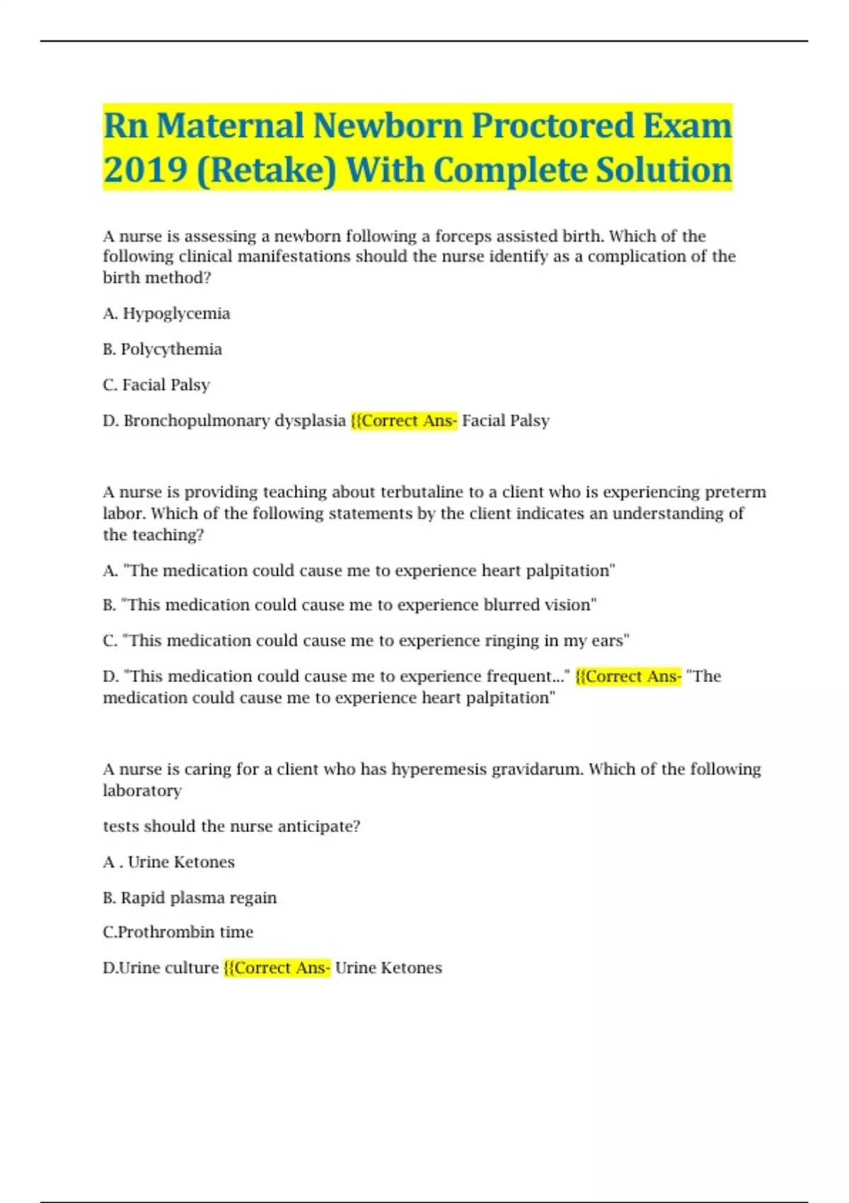 Rn Maternal Newborn Proctored Exam 2019 (Retake) With Complete Solution A nurse is assessing a newborn following a forceps assisted birth. Which of the following clinical manifestations should the nurse identify as a complication of the birth method? A. Hypoglycemia B. Polycythemia C. Facial Palsy D. Bronchopulmonary dysplasia {{Correct Ans- Facial Palsy A nurse is providing teaching about terbutaline to a client who is experiencing preterm labor. Which of the following statements by the client indicates an understanding of the teaching? A. "The medication could cause me to experience heart palpitation" B. "This medication could cause me to experience blurred vision" C. "This medication could cause me to experience ringing in my ears" D. "This medication could cause me to experience frequent..." {{Correct Ans- "The medication could cause me to experience heart palpitation" A nurse is caring for a client who has hyperemesis gravidarum. Which of the following laboratory tests should the nurse anticipate? A . Urine Ketones B. Rapid plasma regain C.Prothrombin time D.Urine culture {{Correct Ans- Urine Ketones A nurse is caring for a client who is in labor and requests nonpharmacological pain management. Which of the following nursing actions promotes client comfort? A. Assisting the client into squatting position B. Having the client lie in a supine position - Having the patient lie in a comfortable position may help reduce sensation of pain due to labor C. Applying fundal pressure during contractions D. Encouraging the client to void every 6 hr {{Correct Ans- Assisting the client into squatting position A nurse caring for a client who is at 20 weeks of gestation and has trichomoniasis. Which of the following findings should the nurse expect? A. Thick, White Vaginal Discharge B. Urinary Frequency C. Vulva Lesions D. Malodorous Discharge {{Correct Ans- Malodorous Discharge A nurse is caring for a client who is 14 weeks of gestation. At which the following locations should the nurse place the Doppler device when assessing the fetal heart rate? A . Midline 2 to 3 cm (0.8 to 1.2 in) above the symphysis pubis B. Left Upper Abdomen C. Two fingerbreadths above the umbilicus D. Lateral at the Xiphoid Proces {{Correct Ans- Midline 2 to 3 cm (0.8 to 1.2 in) above the symphysis pubis A nurse is assessing a client who is at 27 weeks of gestation and has preeclampsia. Which of the following findings should the nurse report to the provider? A. Urine protein concentration 200 mg/ 24 hr B. Creatinine 0.8 mg/ dL C. Hemoglobin 14.8 g/ dL D. Platelet Count 60.000/ mm3 {{Correct Ans- Platelet Count 60.000/ mm3 A nurse is teaching about clomiphene citrate to a client who is experiencing infertility. Which of the following adverse effect should the nurse include? A. Tinnitus B. Urinary Frequency C. Breast Tenderness D. Chills {{Correct Ans- Tinnitus A nurse is assessing a newborn upon admission to the nursery. Which of the following should the nurse expect? A. Bulging Fontanels B. Nasal Flaring C. Length from head to heel of 40 cm (15.7 in) D. Chest circumference 2 cm (0.8 in) smaller than the head circumference {{Correct Ans- Chest circumference 2 cm (0.8 in) smaller than the head circumference A nurse is planning care for a newborn who has neonatal abstinence syndrome. Which of the following interventions should the nurse include in the plan of care. A. Increase the newborn's visual stimulation B. Weigh the newborn every other day C. Discourage parental interaction until after a social evaluation D. Swaddle the newborn in a flexed position {{Correct Ans- Swaddle the newborn in a flexed position A nurse is caring for a newborn who is 6 hr old and has a bedside glucometer reading of 65 mg/ dL. The newborn's mother has type 2 diabetes mellitus. Which of the following actions should the nurse take? A. Obtain a blood sample for a serum glucose level B. Feed the newborn immediately C. Administer 50 mL of dextrose solution IV D. Reassess the blood glucose level prior to the next feeding {{Correct Ans- Reassess the blood glucose level prior to the next feeding A nurse is providing teaching to a client about exercise safety during pregnancy. Which of the following statements by the client indicates an understanding of the teaching? (Select all that apply). A. "I will limit my time in the hot tub to 30 minutes after exercise." B. "I should consume three 8-ounce glasses of water after I exercise." C. "I will check my heart rate every 15 minutes during exercise sessions." D. "I should limit exercise sessions to 30 minutes when the weather is humid." E. "I should rest by lying on my side for 10 minutes following exercise." {{Correct Ans- "I will check my heart rate every 15 minutes during exercise sessions."
