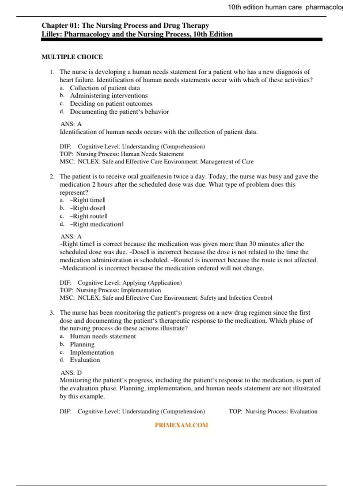 The nurse is developing a human needs statement for a patient who has a new diagnosis of heart failure. Identification of human needs statements occur with which of these activities? a. Collection of patient data b. Administering interventions c. Deciding on patient outcomes d. Documenting the patient‘s behavior ANS: A Identification of human needs occurs with the collection of patient data. DIF: Cognitive Level: Understanding (Comprehension) TOP: Nursing Process: Human Needs Statement MSC: NCLEX: Safe and Effective Care Environment: Management of Care 2. The patient is to receive oral guaifenesin twice a day. Today, the nurse was busy and gave the medication 2 hours after the scheduled dose was due. What type of problem does this represent? a. ―Right time‖ b. ―Right dose‖ c. ―Right route‖ d. ―Right medication‖ ANS: A ―Right time‖ is correct because the medication was given more than 30 minutes after the scheduled dose was due. ―Dose‖ is incorrect because the dose is not related to the time the medication administration is scheduled. ―Route‖ is incorrect because the route is not affected. ―Medication‖ is incorrect because the medication ordered will not change. DIF: Cognitive Level: Applying (Application) TOP: Nursing Process: Implementation MSC: NCLEX: Safe and Effective Care Environment: Safety and Infection Control 3. The nurse has been monitoring the patient‘s progress on a new drug regimen since the first dose and documenting the patient‘s therapeutic response to the medication. Which phase of the nursing process do these actions illustrate? a. Human needs statement b. Planning c. Implementation d. Evaluation ANS: D Monitoring the patient‘s progress, including the patient‘s response to the medication, is part of the evaluation phase. Planning, implementation, and human needs statement are not illustrated by this example. DIF: Cognitive Level: Understanding (Comprehension) TOP: Nursing Process: Evaluation PRIMEXAM.COM MSC: NCLEX: Safe and Effective Care Environment: Management of Care 4. The nurse is assigned to a patient who is newly diagnosed with type 1 diabetes mellitus. Which statement best illustrates an outcome criterion for this patient? a. The patient will follow instructions. b. The patient will not experience complications. c. The patient will adhere to the new insulin treatment regimen. d. The patient will demonstrate correct blood glucose testing technique. ANS: D ―Demonstrating correct blood glucose testing technique‖ is a specific and measurable outcome criterion. ―Following instructions‖ and ―not experiencing complications‖ are not specific criteria. ―Adhering to new regimen‖ would be difficult to measure. DIF: Cognitive Level: Applying (Application) TOP: Nursing Process: Planning MSC: NCLEX: Safe and Effective Care Environment: Management of Care 5. Which activity best reflects the implementation phase of the nursing process for the patient who is newly diagnosed with hypertension? a. Providing education on keeping a journal of blood pressure readings b. Setting goals and outcome criteria with the patient‘s input c. Recording a drug history regarding over-the-counter medications used at home d. Formulating human needs statements regarding deficient knowledge related to the new treatment regimen ANS: A Education is an intervention that occurs during the implementation phase. Setting goals and outcomes reflects the planning phase. Recording a drug history reflects the assessment phase. Formulating human needs statements reflects analysis of data as part of planning. DIF: Cognitive Level: Applying (Application) TOP: Nursing Process: Implementation MSC: NCLEX: Safe and Effective Care Environment: Management of Care 6. The medication order reads, ―Give ondansetron 4 mg, 30 minutes before beginning chemotherapy to prevent nausea.‖ The nurse notes that the route is missing from the order. What is the nurse‘s best action? a. Give the medication intravenously because the patient might vomit. b. Give the medication orally because the tablets are available in 4-mg doses. c. Contact the prescriber to clarify the route of the medication ordered. d. Hold the medication until the prescriber returns to make rounds. ANS: C A complete medication order includes the route of administration. If a medication order does not include the route, the nurse must ask the prescriber to clarify it. The intravenous and oral routes are not interchangeable. Holding the medication until the prescriber returns would mean that the patient would not receive a needed medication. DIF: Cognitive Level: Applying (Application) TOP: Nursing Process: Implementation MSC: NCLEX: Safe and Effective Care Environment: Management of Care PRIMEXAM.COM 7. When the nurse considers the timing of a drug dose, which factor is appropriate to consider when deciding when to give a drug? a. The patient‘s ability to swallow b. The patient‘s height c. The patient‘s last meal d. The patient‘s allergies ANS: C The nurse must consider specific pharmacokinetic/pharmacodynamic drug properties that may be affected by the timing of the last meal. The patient‘s ability to swallow, height, and allergies are not factors to consider regarding the timing of the drug‘s administration. DIF: Cognitive Level: Understanding (Comprehension) TOP: Nursing Process: Assessment MSC: NCLEX: Safe and Effective Care Environment: Management of Care 8. The nurse is performing an assessment of a newly admitted patient. Which is an example of subjective data? a. Weight 155 pounds b. Pulse 72 beats/minute c. The patient reports that he uses the herbal product ginkgo d. The patient‘s complete blood count results ANS: C Subjective data include information shared through the spoken word by any reliable source, such as the patient. Objective data may be defined as any information gathered through the senses or that which is seen, heard, felt, or smelled. A patient‘s pulse, weight, a