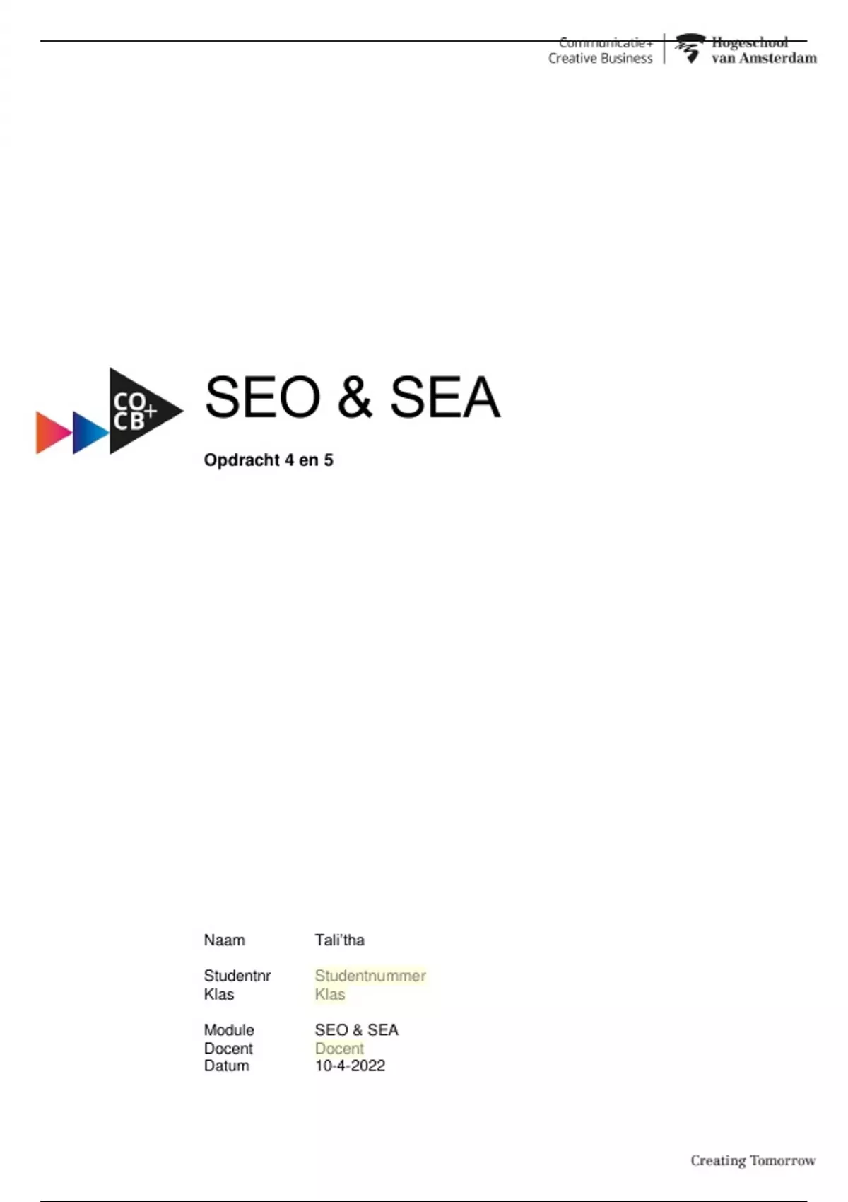 SEO & SEA opdracht 4 en 5 (Cijfer: 9,0)