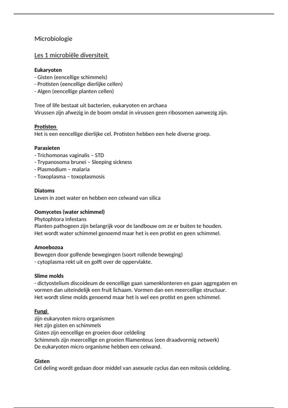 Uitgebreide samenvatting van de theorielessen microbiologie course 6. In dit document komt alles wat tijdens de theorielessen aanbod is gekomen uitgelegd en overzichtelijk neergezet zodat de informatie goed opgenomen kan worden en het te begrijpen is voor het tentamen.