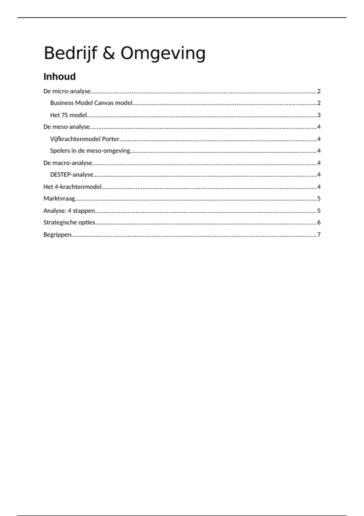 Het document "Bedrijf en Omgeving notities" biedt een overzichtelijke en beknopte samenvatting van het vak Bedrijf en Omgeving. Het document bevat belangrijke concepten, modellen en analyses die relevant zijn voor het begrijpen van de relatie tussen een bedrijf en zijn omgeving. De samenvatting behandelt onderwerpen zoals het businessmodel canvas (BMC), waardepropositie en waardecreatie, missie en visie, het marketingproces en het Value Chain Porter-model. Daarnaast worden ook verschillende analysetechnieken besproken, zoals micro-, meso- en macro-analyse, externe omgeving en duurzaamheid, internationale omgeving en het 4 krachtenmodel van Osterwalder. Het document gaat ook in op koopgedrag en marktvraag. Verder bevat de samenvatting informatie over strategie, inclusief portfolio-analyse en landportfolio-analyse. Met deze uitgebreide samenvatting krijg je een helder overzicht van de belangrijkste aspecten van het vak Bedrijf en Omgeving, waardoor je beter inzicht krijgt in de complexe relatie tussen een bedrijf en de omgeving waarin het opereert.