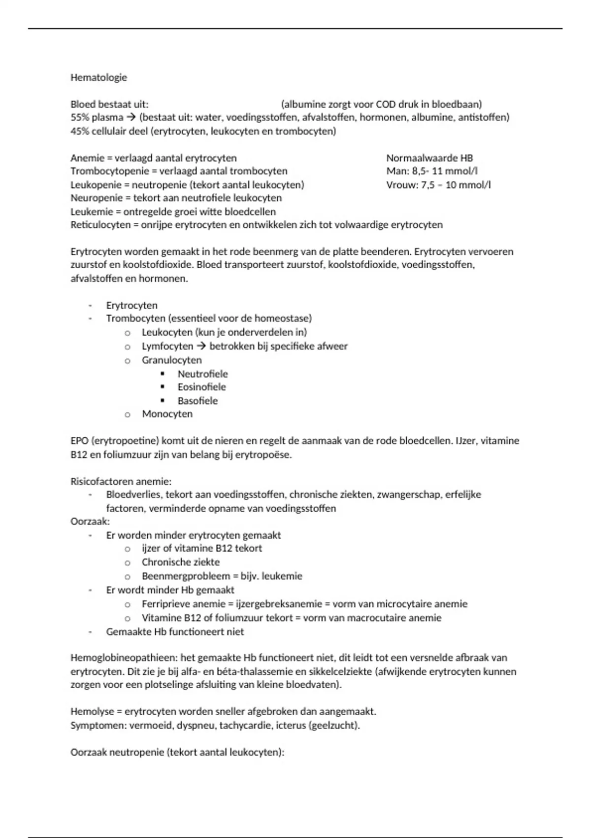 Leukopenie = neutropenie (tekort aantal leukocyten) Vrouw: 7,5 – 10 mmol/l