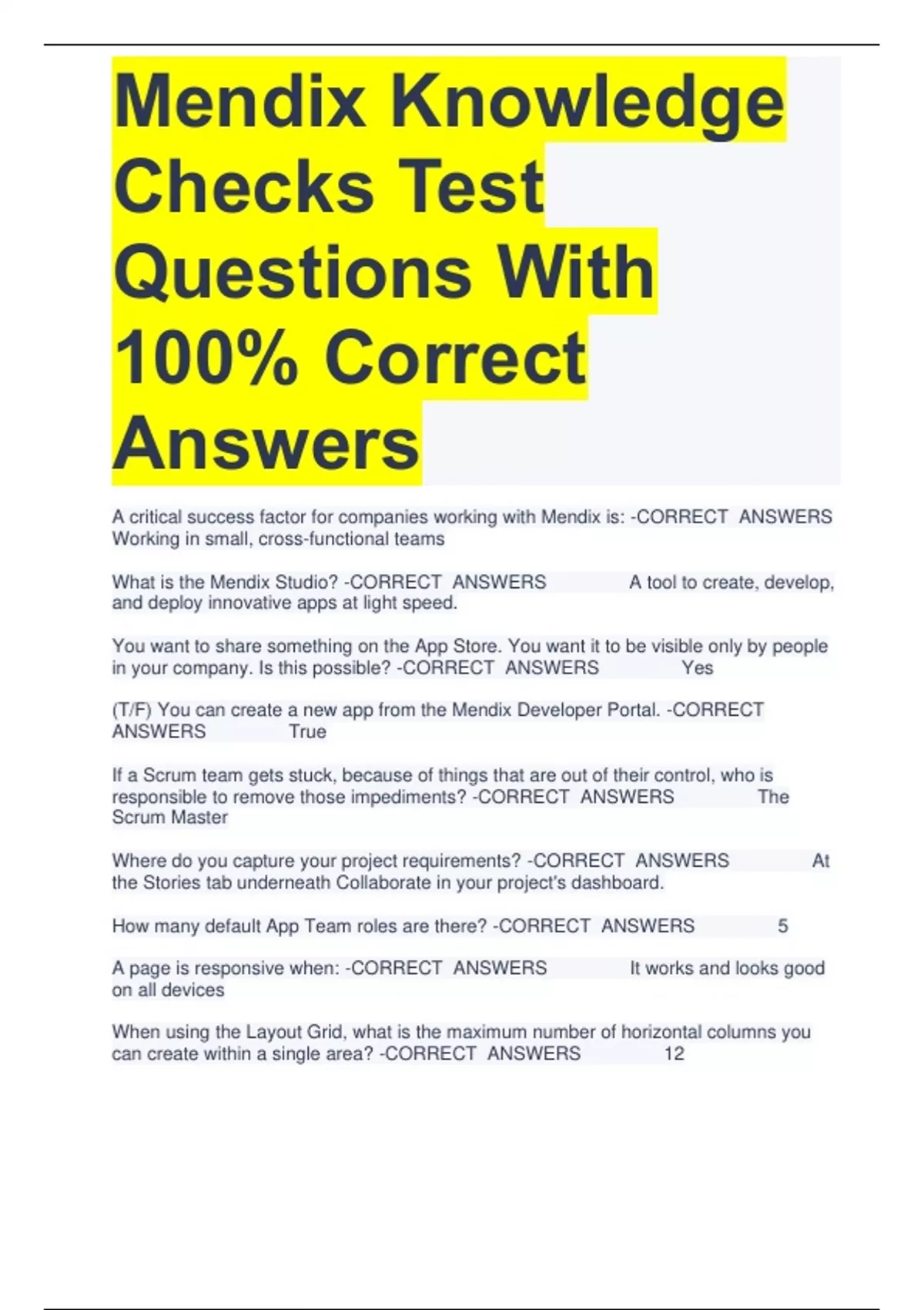 Mendix Knowledge Checks Test Questions With 100% Correct Answers A critical success factor for companies working with Mendix is: -CORRECT ANSWERS Working in small, cross-functional teams What is the Mendix Studio? -CORRECT ANSWERS A tool to create, develop, and deploy innovative apps at light speed. You want to share something on the App Store. You want it to be visible only by people in your company. Is this possible? -CORRECT ANSWERS Yes (T/F) You can create a new app from the Mendix Developer Portal. -CORRECT ANSWERS True If a Scrum team gets stuck, because of things that are out of their control, who is responsible to remove those impediments? -CORRECT ANSWERS The Scrum Master Where do you capture your project requirements? -CORRECT ANSWERS At the Stories tab underneath Collaborate in your project's dashboard. How many default App Team roles are there? -CORRECT ANSWERS 5 A page is responsive when: -CORRECT ANSWERS It works and looks good on all devices When using the Layout Grid, what is the maximum number of horizontal columns you can create within a single area? -CORRECT ANSWERS 12 How many rows can a page have? -CORRECT ANSWERS AS many as you need (T/F) It is possible to place multiple widgets in a container. -CORRECT ANSWERS True (T/F) You can have different row layouts for mobile, tablet, and desktop devices. -CORRECT ANSWERS True What is a page in Mendix? -CORRECT ANSWERS The interface to your app's data and interaction A list view is a widget used to: -CORRECT ANSWERS Display dynamic data The value 1.23 could be stored in an attribute of the type: -CORRECT ANSWERS decimal The attribute type Enumeration is used to store: -CORRECT ANSWERS A list of predefined values A connection between two entities in Mendix is called: -CORRECT ANSWERS An association Which name should you used for an entity representing a maintenance report? -CORRECT ANSWERS MaintenanceReport When configuring an "Add" button that goes to a new edit page, what must you be sure to do? -CORRECT ANSWERS Turn on the Create Object switch What are microflows? -CORRECT ANSWERS A custom logic of a Mendix application What are three microflow components? -CORRECT ANSWERS Activity, End event, Parameter How many start events can a microflow have? -CORRECT ANSWERS One Microflows can be triggered by: -CORRECT ANSWERS Entity event, Action button, Widget event (T/F) Mendix Studio Pro is a WYSIWYG editor. -CORRECT ANSWERS False In Mendix Studio Pro, you can access the Domain Model of your app from: -CORRECT ANSWERS The Project Explorer (T/F) Only users with the SCRUM Master role have access to the Team Server -CORRECT ANSWERS False You downloaded the latest version of the project from the Team Server, and did some changes to the app. What do you need to do next for your team members to be able to view your changes? -CORRECT ANSWERS Commit your changes to the Team Server Which of the following statements is true for Studio Pro and not to Studio? -CORRECT ANSWERS It can run off-line without Internet connection.
