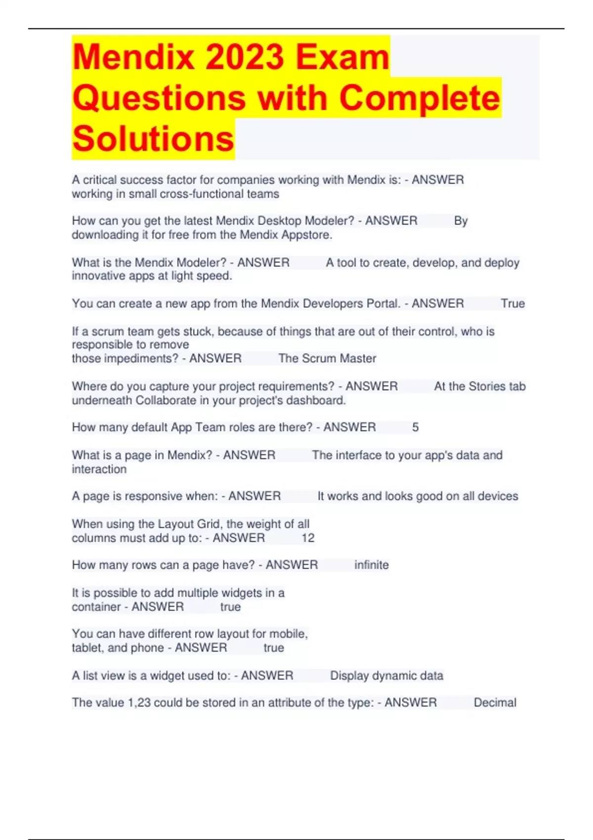 Mendix 2023 Exam Questions with Complete Solutions A critical success factor for companies working with Mendix is: - ANSWER working in small cross-functional teams How can you get the latest Mendix Desktop Modeler? - ANSWER By downloading it for free from the Mendix Appstore. What is the Mendix Modeler? - ANSWER A tool to create, develop, and deploy innovative apps at light speed. You can create a new app from the Mendix Developers Portal. - ANSWER True If a scrum team gets stuck, because of things that are out of their control, who is responsible to remove those impediments? - ANSWER The Scrum Master Where do you capture your project requirements? - ANSWER At the Stories tab underneath Collaborate in your project's dashboard. How many default App Team roles are there? - ANSWER 5 What is a page in Mendix? - ANSWER The interface to your app's data and interaction A page is responsive when: - ANSWER It works and looks good on all devices When using the Layout Grid, the weight of all columns must add up to: - ANSWER 12 How many rows can a page have? - ANSWER infinite It is possible to add multiple widgets in a container - ANSWER true You can have different row layout for mobile, tablet, and phone - ANSWER true A list view is a widget used to: - ANSWER Display dynamic data The value 1,23 could be stored in an attribute of the type: - ANSWER Decimal The Attribute type Enumeration is used to store: - ANSWER A list of predefined values The reference selector is a widget that allows you to: - ANSWER Select and display an associated object What are microflows? - ANSWER The custom logic of a Mendix application What are three microflow components? - ANSWER Activity, Exclusive split, Parameter. How many start events can a microflow have? - ANSWER One