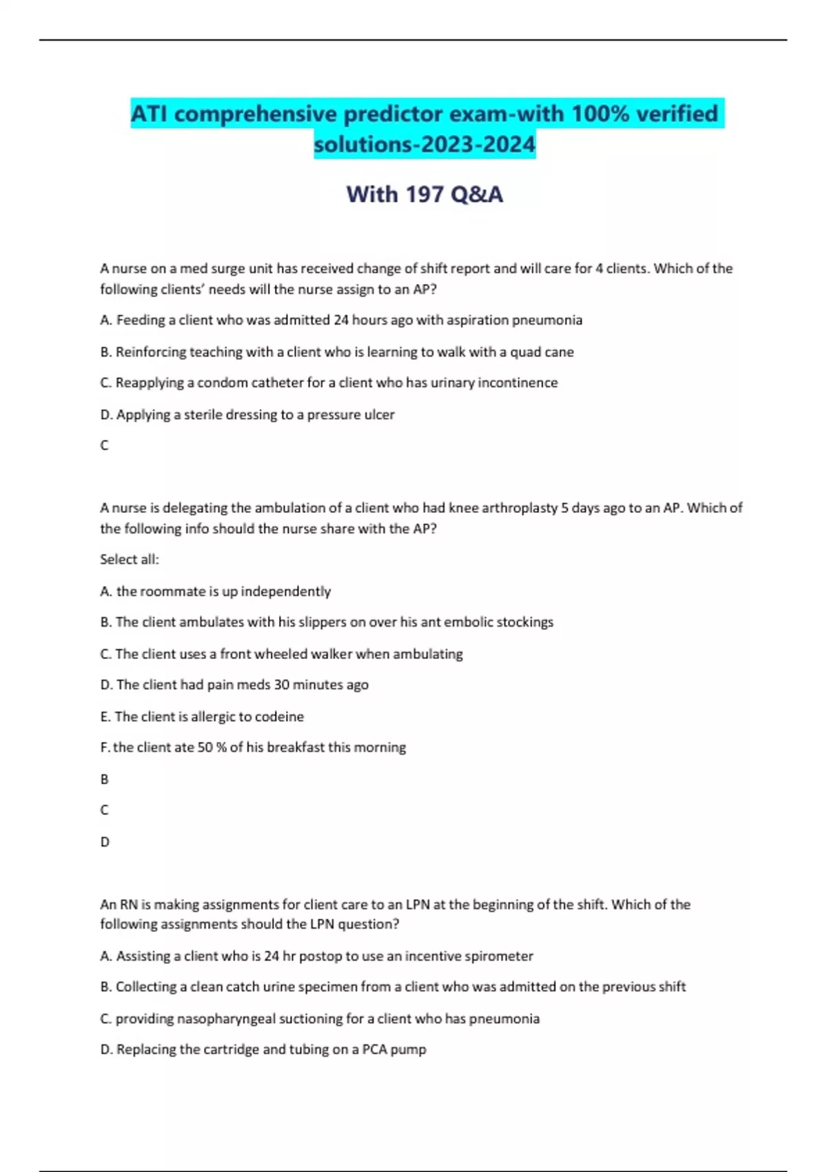 ATI comprehensive predictor exam -with 100% verified solutions -2023-2024 With 197 Q&A A nurse on a med surge unit has received change of shift report and will care for 4 clients. Which of the following clients’ needs will the nurse assign to an AP? A. Feeding a client who was admitted 24 hours ago with aspiration pneumonia B. Reinforcing teaching with a client who is learning to walk with a quad cane C. Reapplying a condom catheter for a client who has urinary incontinence D. Applying a sterile dressing to a pressure ulcer C A nurse is delegating the ambulation of a client who had knee arthroplasty 5 days ago to an AP. Which of the following info should the nurse share with the AP? Select all: A. the roommate is up independently B. The client ambulates with his slippers on over his ant embolic stockings C. The client uses a front wheeled walker when ambulating D. The client had pain meds 30 minutes ago E. The client is allergic to codeine F. the client ate 50 % of his breakfast this morning B C D An RN is making assignments for client care to an LPN at the beginning of the shift. Which of the following assignments should the LPN question? A. Assisting a client who is 24 hr postop to use an incentive spirometer B. Collecting a clean catch urine specimen from a client who was admitted on the previous shift C. providing nasopharyngeal suctioning for a client who has pneumonia D. Replacing the cartridge and tubing on a PCA pump D A nurse is preparing an Inservice program about delegation. Which of the following elements should she identify when presenting the 5 rights of delegation? Select all: A. Right client B. Right supervision/evaluation C. Right direction/communication D. Right time E. Right circumstances B C E A nurse manager of a med surge unit is assigning care responsibilities for the oncoming sh ift. A client is waiting transfer back to the unit from the PACU following thoracic surgery. To which staff member should the nurse assign the client? A. Charge nurse B. RN C. LVN D. AP B What is the study of conduct and character? Ethics What are the values and beliefs that guide behavior and decision making? Morals What is the right to make ones own personal decisions, even tho those decisions might not be in the persons best interest Autonomy What are positive actions to help others Beneficience What is an agreement to keep promises Fidelity What is fairness in care delivery and use of resources Justice What is avoidance of harm or injury Non -maleficence A nurse is caring for a client who decides not to have surgery despite significant blockages in his coronary arteries. The nurse understands that this clients choice is an example of what principles? A. Fidelity B. Autonomy C. Justice D. Nonmalificience A A nurse offers pain meds to a client who is postop prior to ambulation. The nurse understands that this aspect of care delivery is an example of which of the following ethical principles? A. Fidelity B. Autonomy C. Justice D. Beneficience D A nurse is instructing a group of nursing students about the responsibilities involved with organ donation and procurement. When the nurse explains that all clients waiting for a kidney transplant have to meet