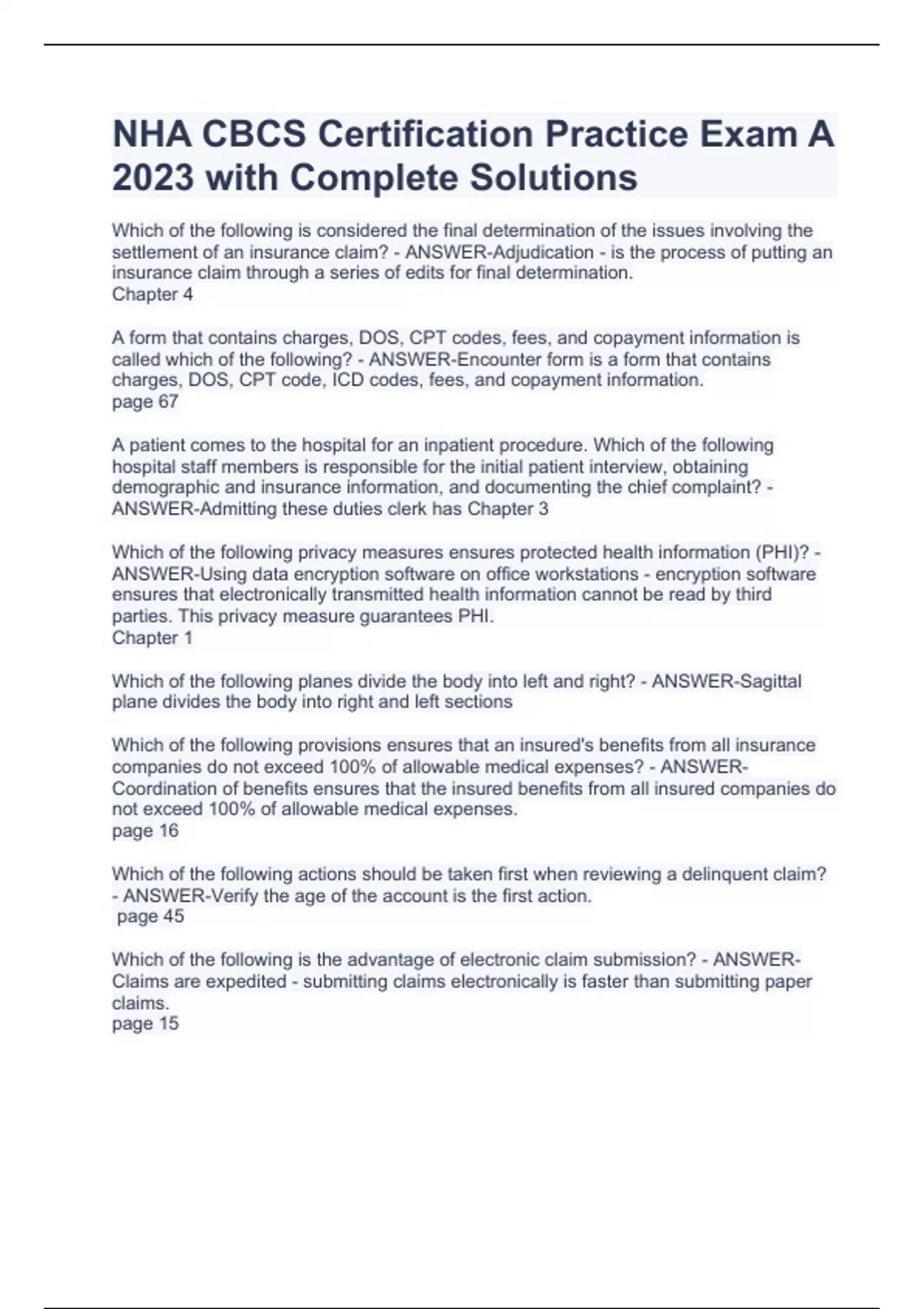 NHA CBCS Certification Practice Exam A 2023 with Complete SolutionsNHA CBCS Certification Practice Exam A 2023 with Complete SolutionsNHA CBCS Certification Practice Exam A 2023 with Complete Solutions Which of the following is considered the final determination of the issues involving the settlement of an insurance claim? - ANSWER-Adjudication - is the process of putting an insurance claim through a series of edits for final determination. Chapter 4 A form that contains charges, DOS, CPT codes, fees, and copayment information is called which of the following? - ANSWER-Encounter form is a form that contains charges, DOS, CPT code, ICD codes, fees, and copayment information. page 67 A patient comes to the hospital for an inpatient procedure. Which of the following hospital staff members is responsible for the initial patient interview, obtaining demographic and insurance information, and documenting the chief complaint? - ANSWER-Admitting these duties clerk has Chapter 3 Which of the following privacy measures ensures protected health information (PHI)? - ANSWER-Using data encryption software on office workstations - encryption software ensures that electronically transmitted health information cannot be read by third parties. This privacy measure guarantees PHI. Chapter 1 Which of the following planes divide the body into left and right? - ANSWER-Sagittal plane divides the body into right and left sections Which of the following provisions ensures that an insured's benefits from all insurance companies do not exceed 100% of allowable medical expenses? - ANSWER-Coordination of benefits ensures that the insured benefits from all insured companies do not exceed 100% of allowable medical expenses. page 16 Which of the following actions should be taken first when reviewing a delinquent claim? - ANSWER-Verify the age of the account is the first action. page 45 Which of the following is the advantage of electronic claim submission? - ANSWER-Claims are expedited - submitting claims electronically is faster than submitting paper claims. page 15