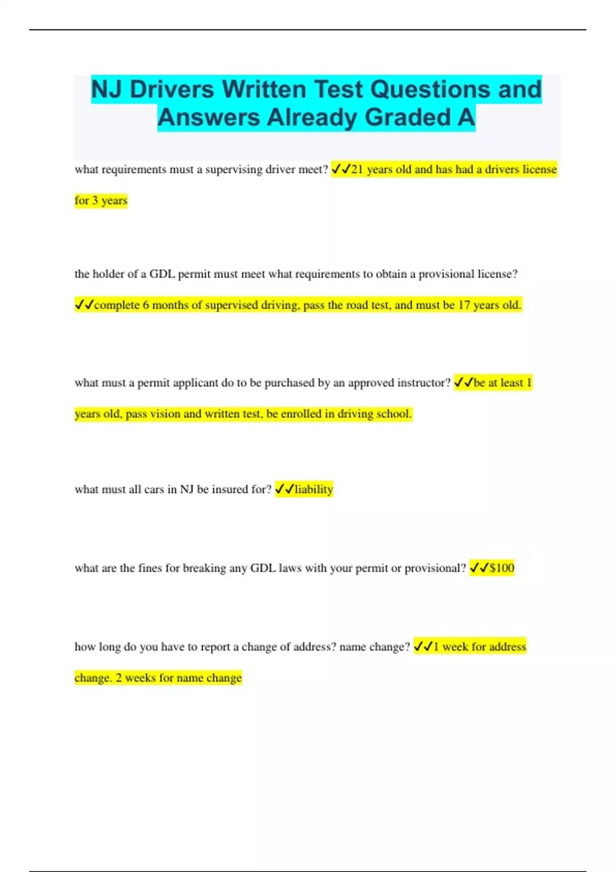 NJ Drivers Written Test Questions and Answers Already Graded A