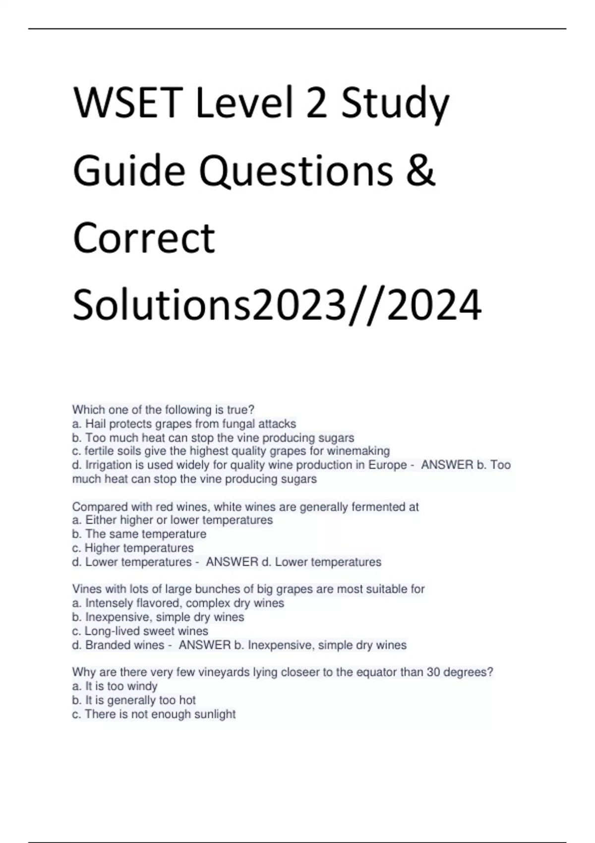WSET Level 2 Study Guide Questions & Correct Solutions2023//2024 Which one of the following is true? a. Hail protects grapes from fungal attacks b. Too much heat can stop the vine producing sugars c. fertile soils give the highest quality grapes for winemaking d. Irrigation is used widely for quality wine production in Europe - ANSWER b. Too much heat can stop the vine producing sugars Compared with red wines, white wines are generally fermented at a. Either higher or lower temperatures b. The same temperature c. Higher temperatures d. Lower temperatures - ANSWER d. Lower temperatures Vines with lots of large bunches of big grapes are most suitable for a. Intensely flavored, complex dry wines b. Inexpensive, simple dry wines c. Long-lived sweet wines d. Branded wines - ANSWER b. Inexpensive, simple dry wines Why are there very few vineyards lying closeer to the equator than 30 degrees? a. It is too windy b. It is generally too hot c. There is not enough sunlight d. It is generally too cold - ANSWER b. It is generally too hot Which one of the following describes the production of STILL RED wines? a. Crush-Press-Ferment (15-20 degrees C) b. Crush-Ferment (25-30 C)-Press c. Ferment (25-30 C)-Fortify-age in sloera-blend d. Ferment (15-20 C)-bottle-Second fermentation-Disgorge - ANSWER b. CrushFerment (25-30 C)-Press Which of the following does not add flavors to red wine? a. New oak barrels b. Fermantation c. Glass bottles d. Grape skins - ANSWER c. Glass bottles "Pale lemon color, green fruit and smoky mineral aromas; dry with high acidity" describes which wine? a. Chablis AC b. Oaked Hunter Valley Chardonnay c. Chianti Classico DOC d. Cote Rotie AC - ANSWER a. Chablis AC Which of the following pairs of regions are famous for premium wine made from Syrah/Shiraz? a. Burgundy & Sancerre b. Orvieto & Marlborough c. Hermitage & Barossa Valley d. Pomerol & St. Emilion - ANSWER c. Hermitage & Barossa Valley Which of the following gape varieties is often used to add color and tannin in a blend with Merlot? a. Pinot Grigio b. Pinot Noir c. Riesling d. Cabernet Sauvignon - ANSWER d. Cabernet Sauvignon Which of the following grape varieties is typically used for dry, unoaked white wines with pungent herbaceous flavors and high acidity? a. Cabernet Sauvignon b. Sauvignon Blanc c. Chardonnay d. Grenache - ANSWER b. Sauvignon Blan