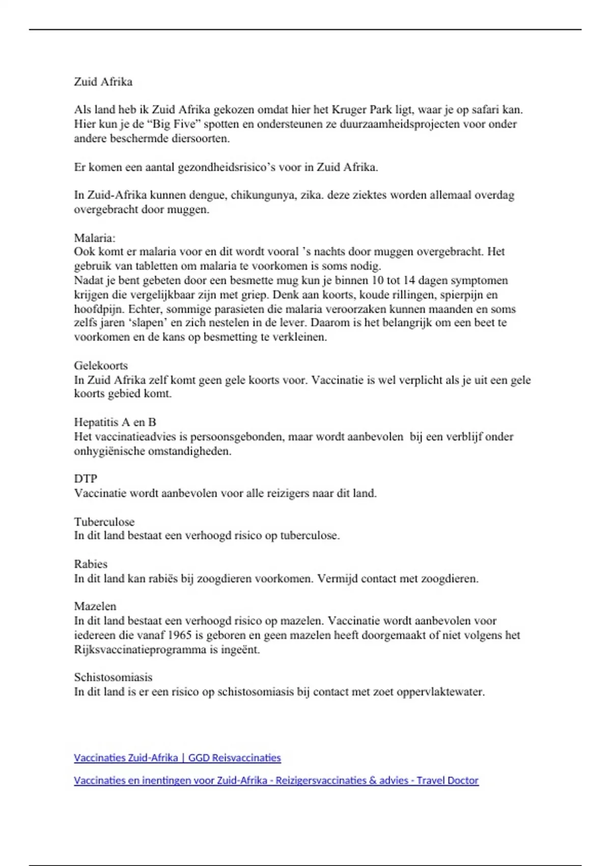 Als land heb ik Zuid Afrika gekozen omdat hier het Kruger Park ligt, waar je op safari kan.