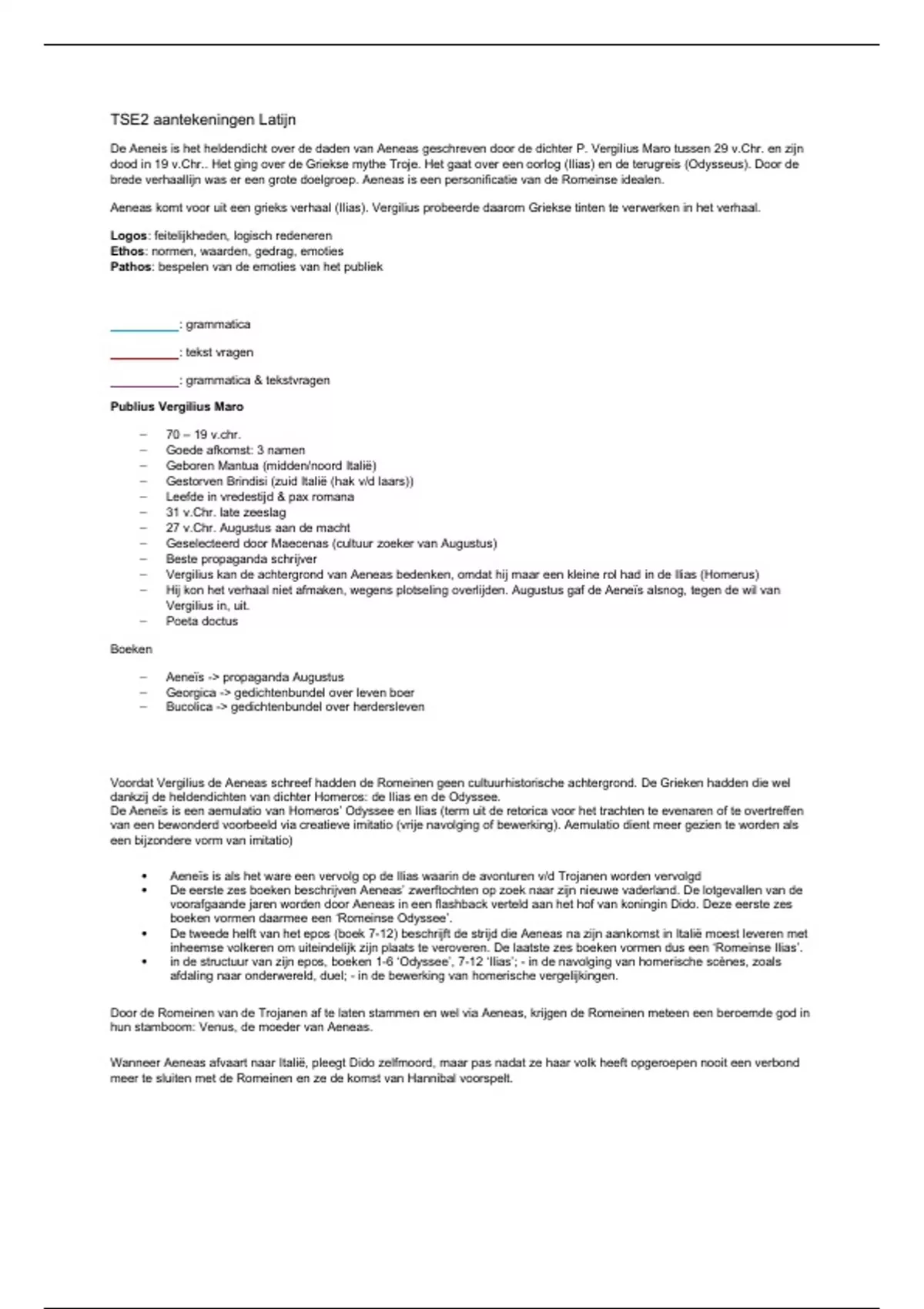 Samenvatting over situatie Anna en Dido Latijnse teksten, vertaling en analyse van teksten 12.1a Verlangen, 12.3a De woede van Dido, 12.4a Verwensing, Inleiding (arma virumque), b. Aneas ontmoet Dido, c. Dido keert zich af, d. Aeneas ontdekt de zelfmoord van Dido, e. Iuno verlost Dido uit haar lijden Een uitgebreid grammatica overzicht: scanderen, gerundi(v)um, conjunctivus, deponens, Ablativus Absolutus, PPA, Genitivus objectivus, Genitivus subjectivus, Relatieve aansluiting