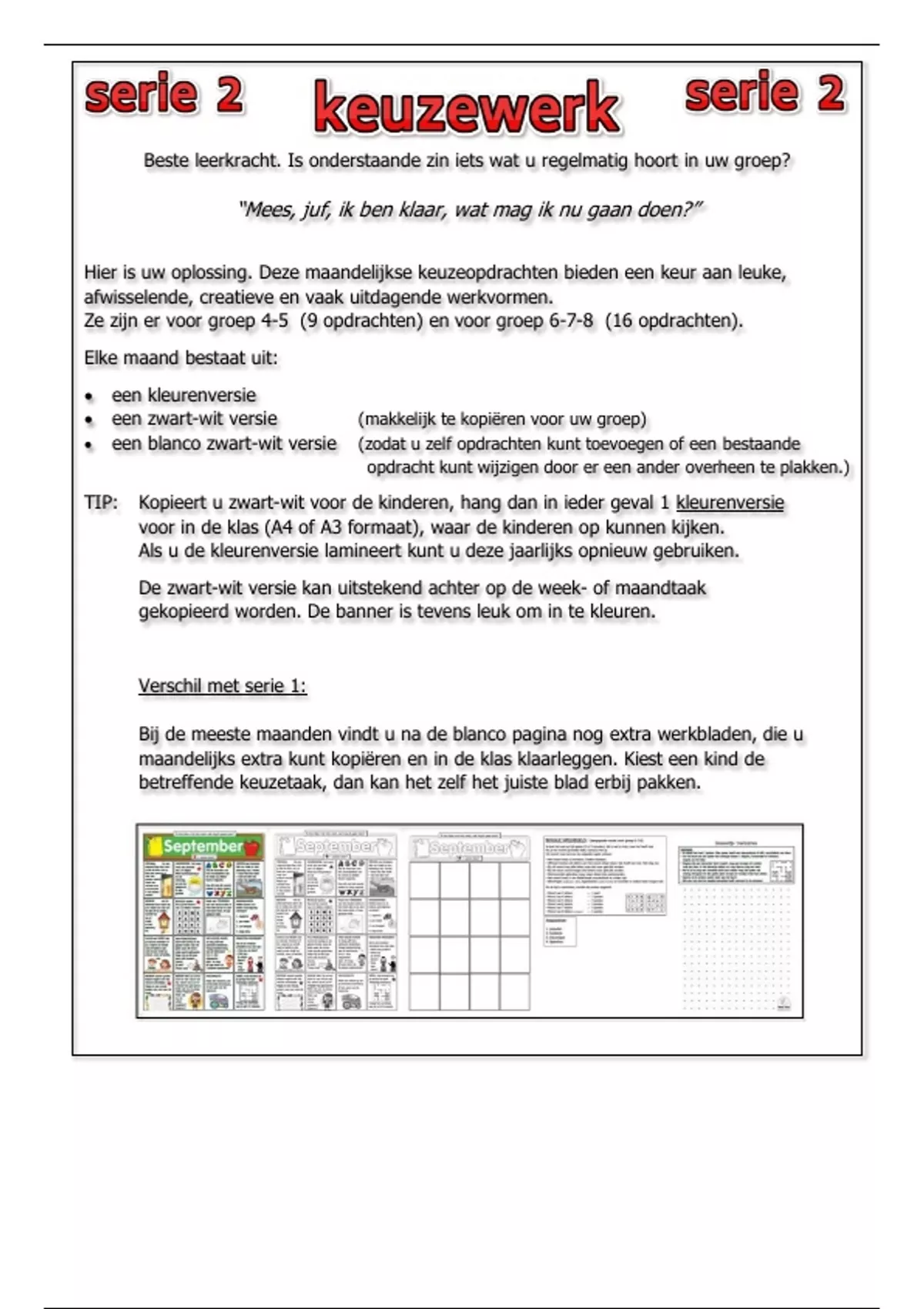 Deze maandelijkse keuzeopdrachten bieden een keur aan leuke, afwisselende, creatieve en vaak uitdagende werkvormen. Ze zijn er voor groep 4-5 (9 opdrachten) en voor groep 6-7-8 (16 opdrachten). Elke maand bestaat uit: een kleurenversie, een zwart-wit versie (makkelijk te kopiëren voor uw groep) en een blanco zwart-wit versie (zodat u zelf opdrachten kunt toevoegen of een bestaande opdracht kunt wijzigen door er een ander overheen te plakken.) In deze serie 2 zijn er heel veel extra bladen bij elke maand, zodat het totaal pagina's op 123 komt.