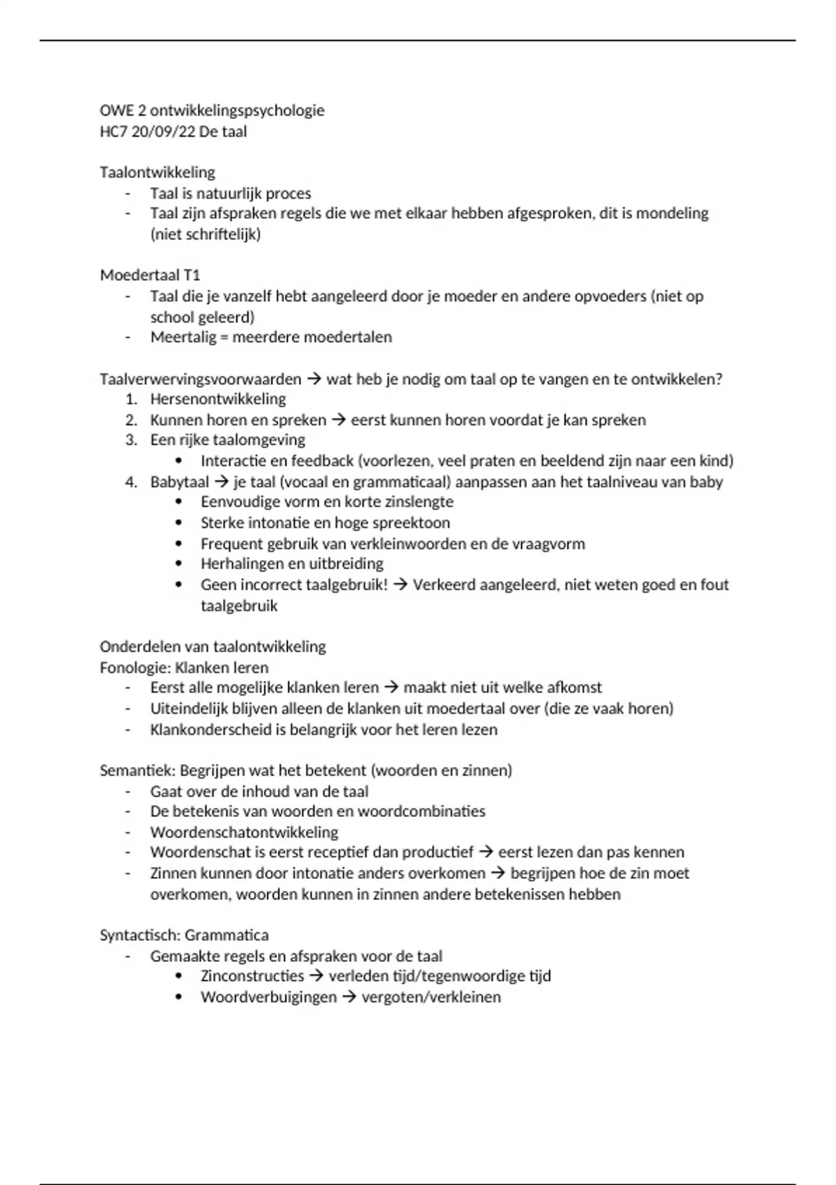 Samenvatting en aantekeningen van het hoorcollege 7 van ontwikkelingspsychologie over de taalontwikkeling van leerlingen op het basisonderwijs. Pabo Nijmegen OWE 1.02 1e jaar propedeuse jaar koen steenman, femme augustus, Zeno swijtink