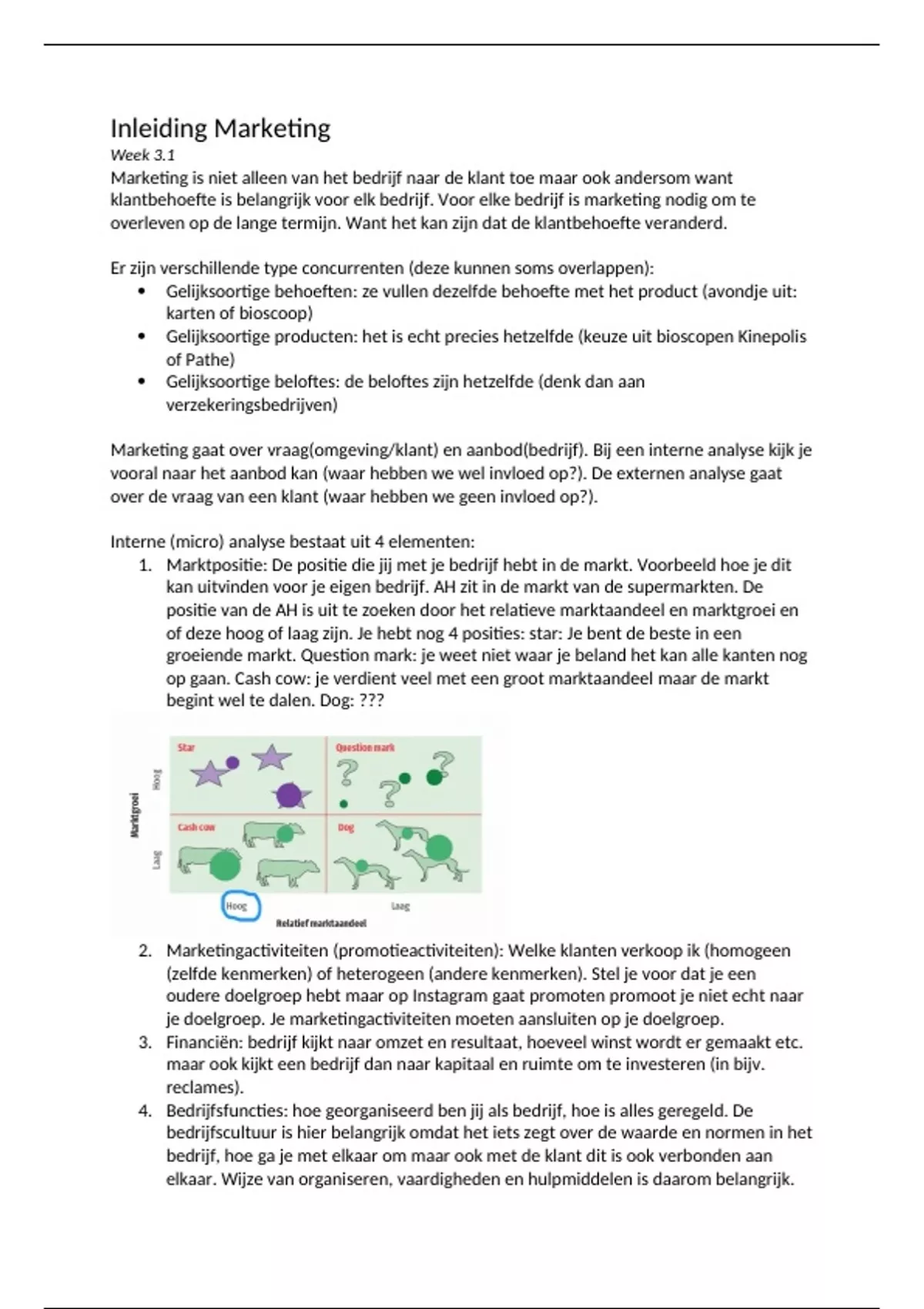 Marketing gaat over vraag(omgeving/klant) en aanbod(bedrijf). Bij een interne analyse kijk je