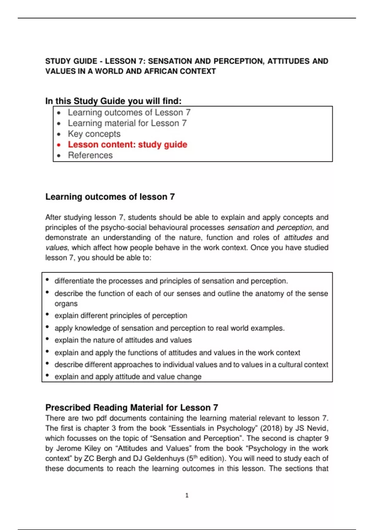 STUDY GUIDE - LESSON 7: SENSATION AND PERCEPTION, ATTITUDES AND
