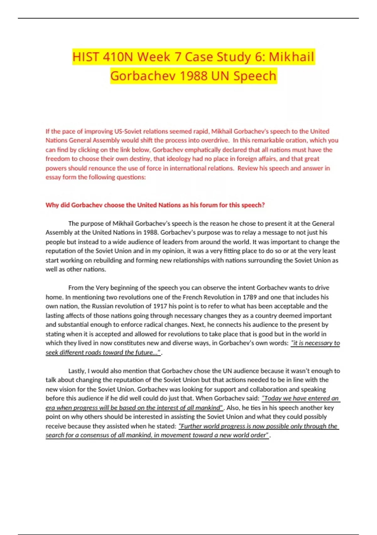 HIST 410N Week 7 Case Study 6: Mikhail Gorbachev 1988 UN Speech