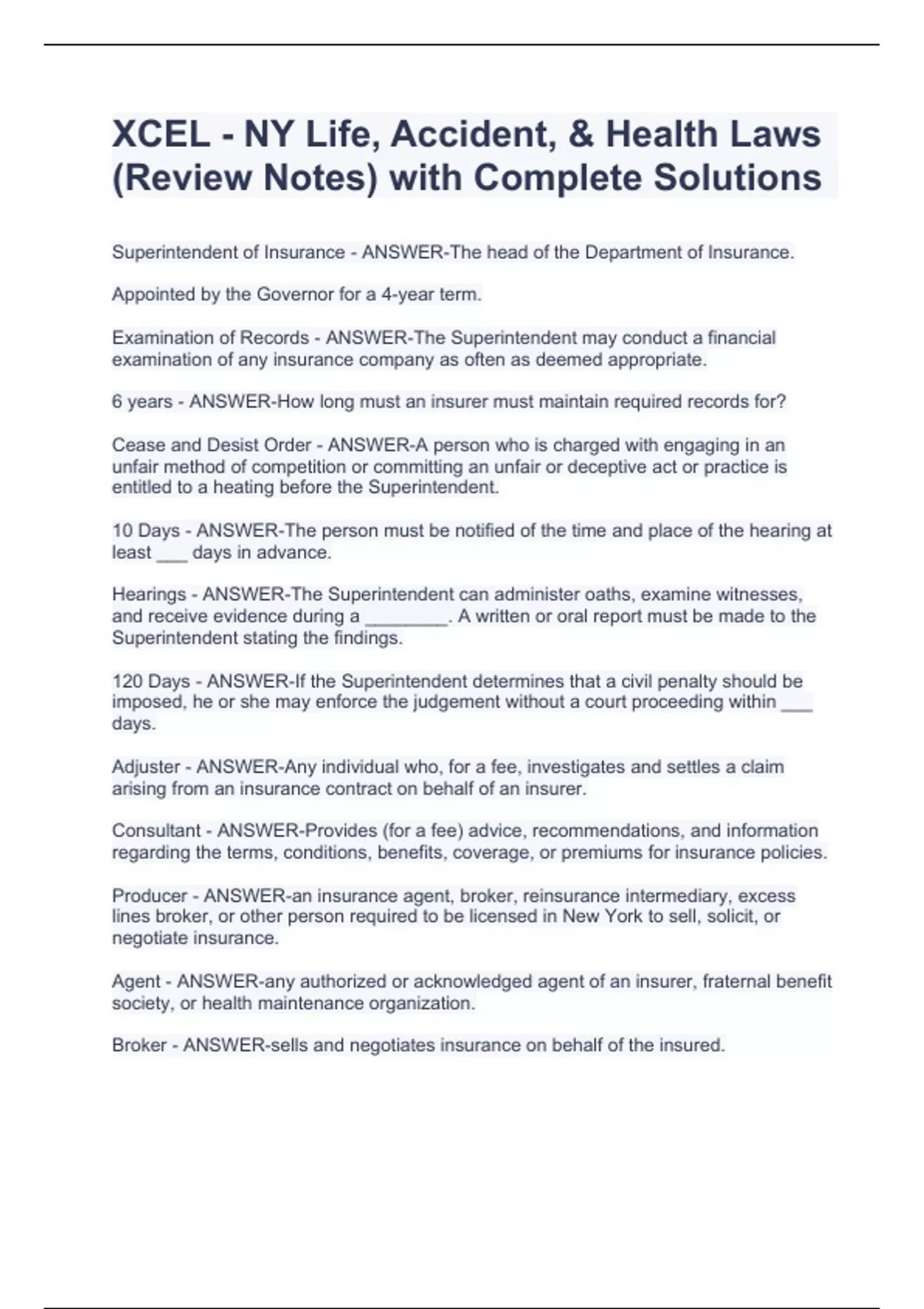 XCEL - NY Life, Accident, & Health Laws (Review Notes) with Complete SolutionsXCEL - NY Life, Accident, & Health Laws (Review Notes) with Complete SolutionsXCEL - NY Life, Accident, & Health Laws (Review Notes) with Complete Solutions Superintendent of Insurance - ANSWER-The head of the Department of Insurance. Appointed by the Governor for a 4-year term. Examination of Records - ANSWER-The Superintendent may conduct a financial examination of any insurance company as often as deemed appropriate. 6 years - ANSWER-How long must an insurer must maintain required records for? Cease and Desist Order - ANSWER-A person who is charged with engaging in an unfair method of competition or committing an unfair or deceptive act or practice is entitled to a heating before the Superintendent. 10 Days - ANSWER-The person must be notified of the time and place of the hearing at least ___ days in advance. Hearings - ANSWER-The Superintendent can administer oaths, examine witnesses, and receive evidence during a ________. A written or oral report must be made to the Superintendent stating the findings. 120 Days - ANSWER-If the Superintendent determines that a civil penalty should be imposed, he or she may enforce the judgement without a court proceeding within ___ days. Adjuster - ANSWER-Any individual who, for a fee, investigates and settles a claim arising from an insurance contract on behalf of an insurer. Consultant - ANSWER-Provides (for a fee) advice, recommendations, and information regarding the terms, conditions, benefits, coverage, or premiums for insurance policies. Producer - ANSWER-an insurance agent, broker, reinsurance intermediary, excess lines broker, or other person required to be licensed in New York to sell, solicit, or negotiate insurance.