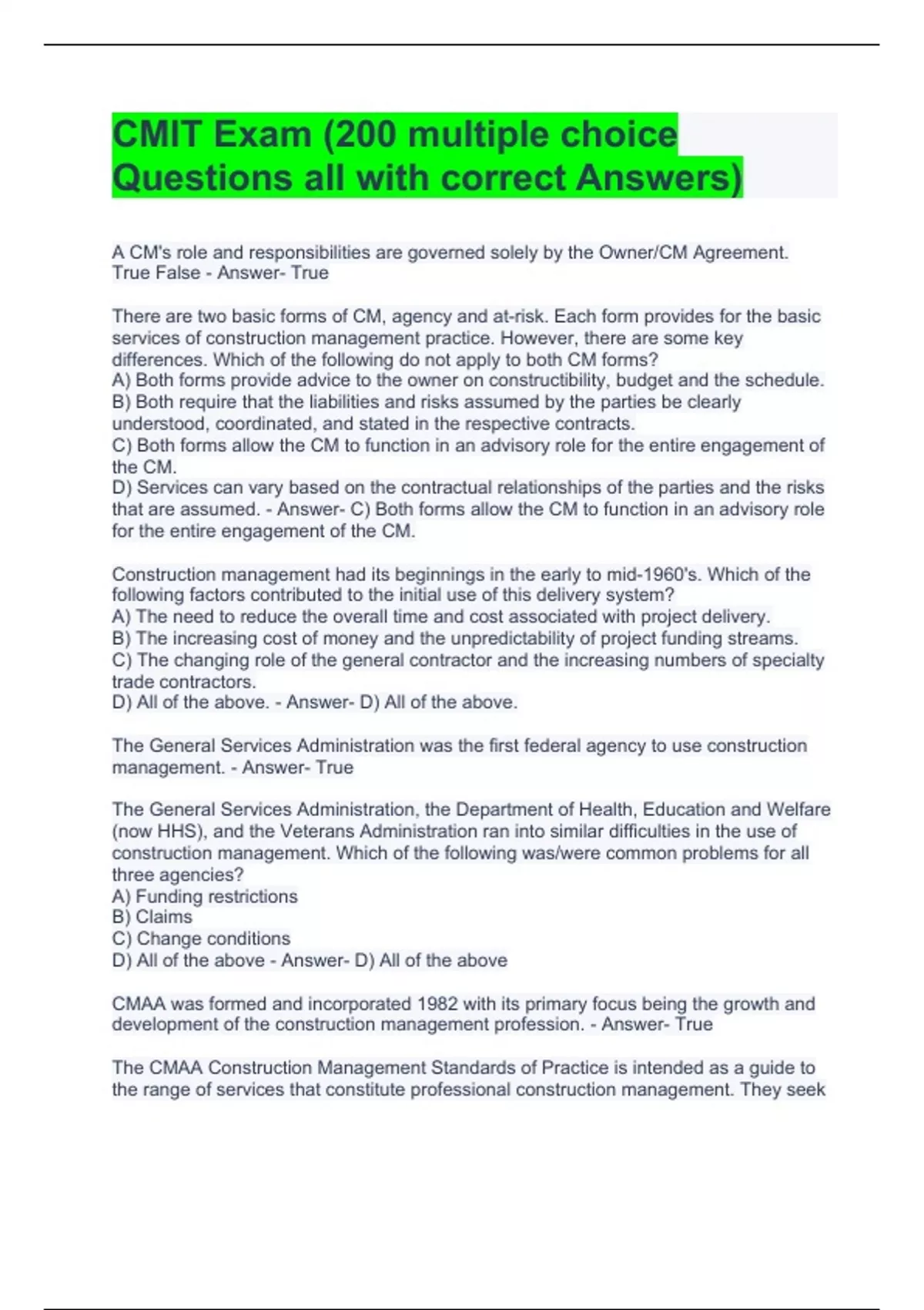 A CM's role and responsibilities are governed solely by the Owner/CM Agreement. True False - Answer- True There are two basic forms of CM, agency and at-risk. Each form provides for the basic services of construction management practice. However, there are some key differences. Which of the following do not apply to both CM forms? A) Both forms provide advice to the owner on constructibility, budget and the schedule. B) Both require that the liabilities and risks assumed by the parties be clearly understood, coordinated, and stated in the respective contracts. C) Both forms allow the CM to function in an advisory role for the entire engagement of the CM. D) Services can vary based on the contractual relationships of the parties and the risks that are assumed. - Answer- C) Both forms allow the CM to function in an advisory role for the entire engagement of the CM. Construction management had its beginnings in the early to mid-1960's. Which of the following factors contributed to the initial use of this delivery system? A) The need to reduce the overall time and cost associated with project delivery. B) The increasing cost of money and the unpredictability of project funding streams. C) The changing role of the general contractor and the increasing numbers of specialty trade contractors. D) All of the above. - Answer- D) All of the above. The General Services Administration was the first federal agency to use construction management. - Answer- True The General Services Administration, the Department of Health, Education and Welfare (now HHS), and the Veterans Administration ran into similar difficulties in the use of construction management. Which of the following was/were common problems for all three agencies? A) Funding restrictions B) Claims C) Change conditions D) All of the above - Answer- D) All of the above CMAA was formed and incorporated 1982 with its primary focus being the growth and development of the construction management profession. - Answer- True The CMAA Construction Management Standards of Practice is intended as a guide to the range of services that constitute professional construction management. They seek to meet the documented need for definitions of what construction management services are, without unduly structuring the methodologies by which those services are provided by the CM. - Answer- True The goals of the Construction Management Association of America (CMAA) include: A) Setting standards and developing contract documents for construction management practice. B) Expanding the understanding of the construction management concept and its use in the marketplace. C) Advocacy for construction management in the legislative, regulatory, and judicial arenas of federal, state, and local governments. D) All of the above. - Answer- D) All of the above The fact that an individual is certified or licensed in any other profession does not, per se, establish him/her as a qualified CM. True False - Answer- True Certification as a CM means the construction management practitioner has "state of the art" knowledge and capability to practice construction management. True False - Answer- False Recruiting and training are business matters and normally do not involve ethical concerns. True False - Answer- False Construction management is a concept that is susceptible to overselling. True False - Answer- True Failure to provide quality services is a business and not an ethical question. True False - Answer- False Contracting for adequate fees is both a business and an ethical issue. True False - Answer- True The ethics of the CM profession focus primarily on a CM's relationships in dealing with its clients. True False - Answer- True The possible approaches for delivering a project are virtually unlimited. A key reason for such variations is: A) The different roles that can be assumed by project participants. B) Different forms of contracts and methods of compensation that can be used. C) The different levels of care, responsibility, and risks assumed by the parties involved. D) All of the above. - Answer- D) All of the above The traditional delivery system is characterized by executing the major phases of a project in: A) An overlapping concept B) A linear sequence C) A fast track method D) All of the above - Answer- B) A linear sequence A key advantage of the traditional delivery approach is: A) With the traditional delivery system, the cost of the construction phase is known before construction starts. B) Facility features are fully determined & specified. C) When the construction contract is signed, the major risk belongs to the contractor. D) All of the above - Answer- B) Facility features are fully determined & specified. Design-build and at-risk construction management delivery systems allow the option to fast-track or phase a project. True False - Answer- True Most definitions of construction management are similar. However, a contractual definition is not known until: A) The legal form of the CM contract is chosen. B) The specific scope of services to be provided is identified. C) The relationship of the CM to others and the risks and authority assumed by the parties are clearly defined. D) All of the above - Answer- D) All of the above 21. In a CM-at-Risk arrangement once construction begins and the CM converts from the professional advisory role of a CM to the contractual role of a general contractor, the CM has no implied duties of loyalty and care to the owner. True False - Answer- True The agency CM does not perform design or actual construction work. True False - Answer- True Under the CM-at-Risk delivery method, the owner usually must deal with the hybrid of a construction manager and a general contractor. True False - Answer- True Under a CM-at-risk contract, which of the following statements are true? A) The CM, in most cases, holds the trade and/or specialty contracts. B) The CM has the right to enforce the schedule, pay the trade or subcontractors, and terminate