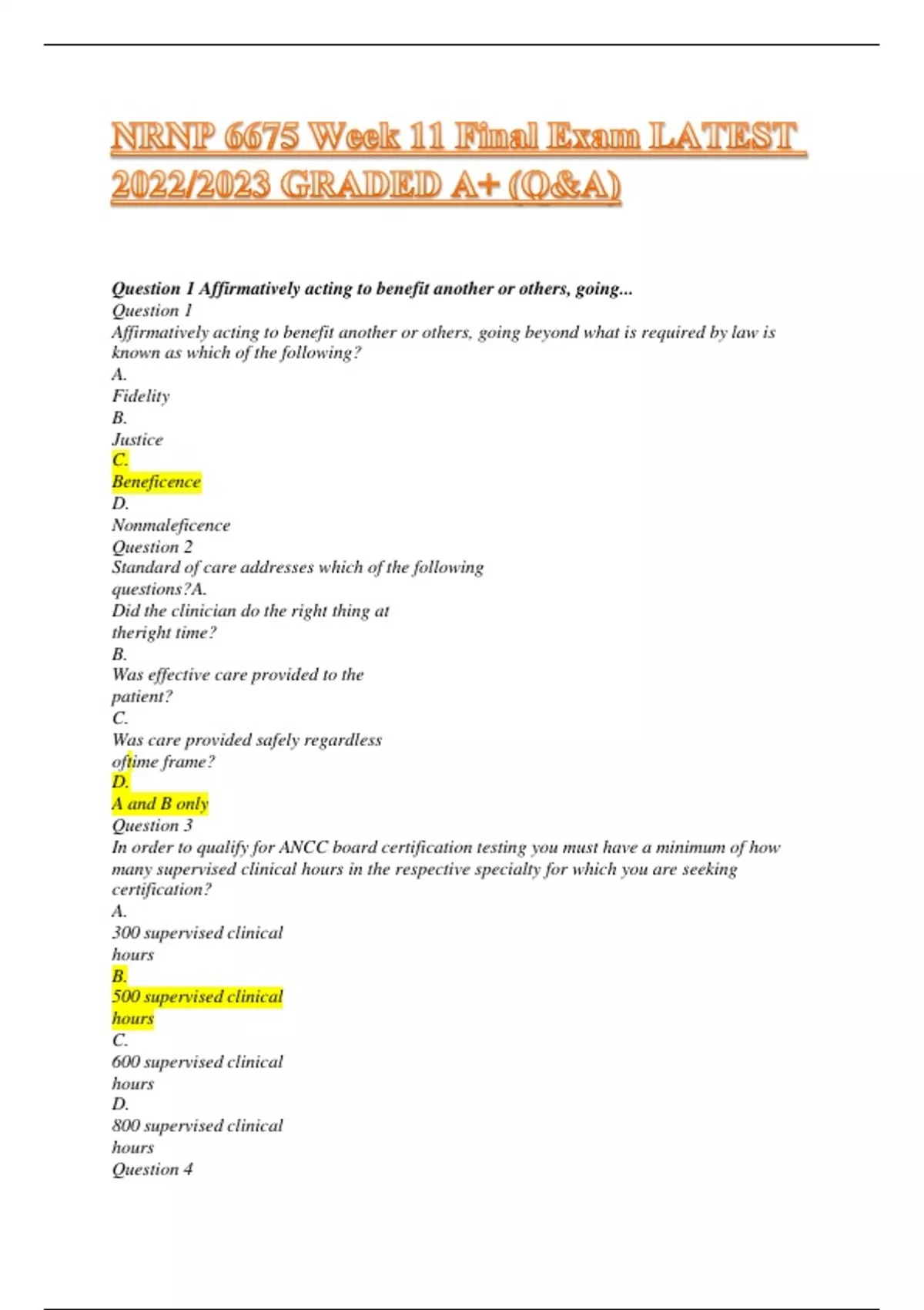 NRNP 6675 Week 11 Final Exam LATEST 2022/2023 GRADED A+ (Q&A) Question 1 Affirmatively acting to benefit another or others, going... Question 1 Affirmatively acting to benefit another or others, going beyond what is required by law is known as which of the following? A. Fidelity B. Justice C. Beneficence D. Nonmaleficence Question 2 Standard of care addresses which of the following questions? A. Did the clinician do the right thing at the right time? B. Was effective care provided to the patient? C. Was care provided safely regardless of time frame? D. A and B only Question 3 In order to qualify for ANCC board certification testing you must have a minimum of how many supervised clinical hours in the respective specialty for which you are seeking certification? A. 300 supervised clinical hours B. 500 supervised clinical hours C. 600 supervised clinical hours D. 800 supervised clinical hours Question 4 All of the following are risk factors for sexual assault EXCEPT A. Religion B. Serious mental illness C. Substance use disorder D. Family history of sexual abuse Question 5 A personality disorder characterized by emotional constriction, orderliness, perseverance, stubbornness, indecisiveness, and a pervasive pattern of perfectionism and inflexibility is known as which of the following? A. Depressive personality disorder B. Borderline personality disorder C. Dependent personality disorder D. Obsessive-compulsive personality disorder Question 6 A late-appearing adverse effect of neuroleptic drugs is known as which of the following? A. Akathisia B. Parkinsonism C. Neuroleptic malignant syndrome D. Neuroleptic-induced tardive dyskinesia Question 7