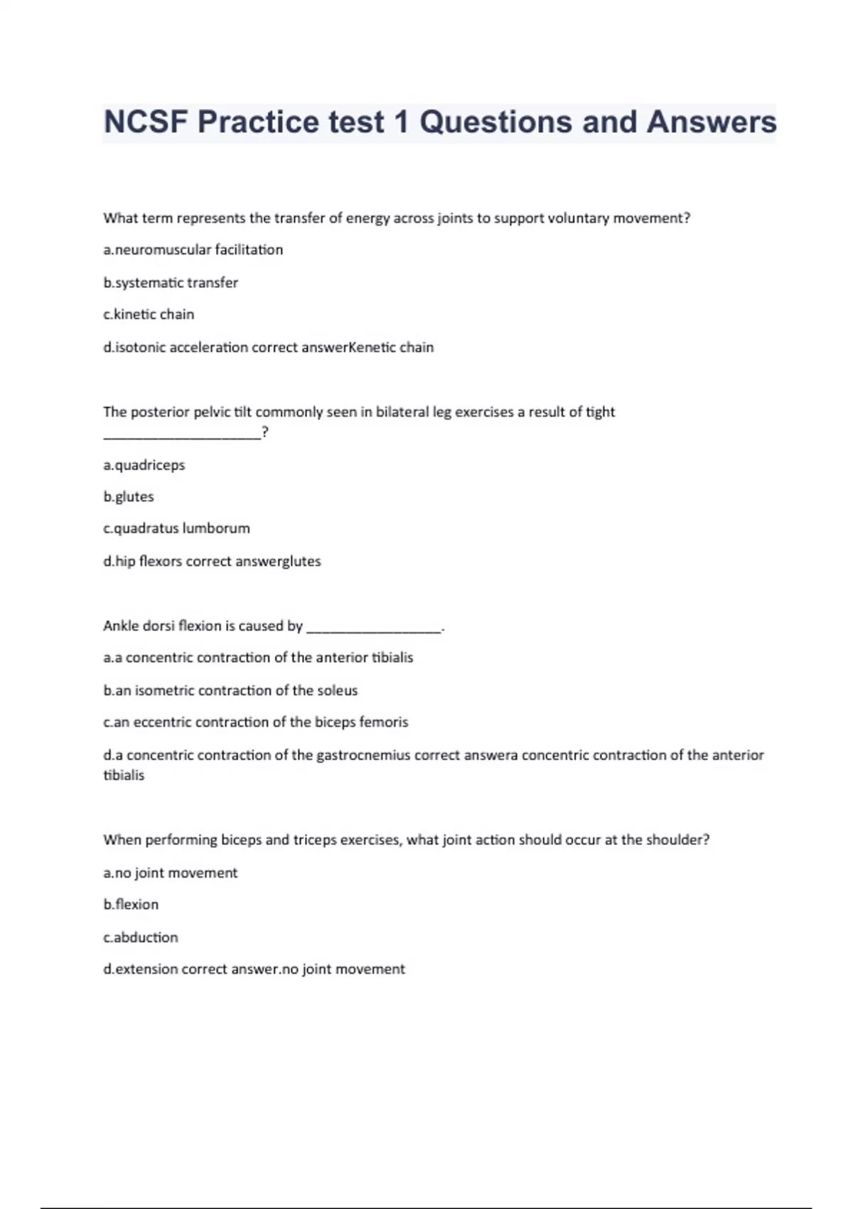 NCSF Practice test 1 Questions and Answers. What term represents the transfer of energy across joints to support voluntary movement? muscular facilitation matic transfer ic chain nic acceleration correct answerKenetic chain The posterior pelvic tilt commonly seen in bilateral leg exercises a result of tight ____________________? iceps s atus lumborum flexors correct answerglutes Ankle dorsi flexion is caused by _________________. a.a concentric contraction of the anterior tibialis isometric contraction of the soleus eccentric contraction of the biceps femoris d.a concentric contraction of the gastrocnemius correct answera concentric contraction of the anterior tibialis When performing biceps and triceps exercises, what joint action should occur at the shoulder? joint movement on tion sion correct joint movement What exercise is used to cause elevation of the shoulder complex (scapulae and humerus)? -up ary press ell shrug d row correct answerdumbbell shrug What is the natural curvature of the thoracic spine? tic curve al curve tic curve l curve correct answerkyphotic curve When performed correctly, what is the prime mover responsible for hip extension during the back squat? tor magnus s lateralis rius us maximus correct answergluteus maximus What back muscle is the prime mover for the seated row exercise as it is responsible for retraction of the scapula? simus dorsi oids zius spinatus correct answerrhomboids Which of the following exercises requires the greatest contribution from trunk stabilizers when using 80% 1RM? d leg extension ll bent-over row press press correct answerbarbell bent-over row The performance of dumbbell side raises occurs in what movement plane? ior tal al verse correct answerfrontal What position of the knee is necessary to fully stretch the gastrocnemius when the ankle is in full dorsi flexion? ally flexed flexed extended is not affected by the knee in dorsi flexion correct answerfully extended What muscles are used to globally stabilize the humerus during the bench press? simus dorsi and deltoid ralis major and minor s abdominis and erector spinae ues and transverse abdominis correct answerlatissimus dorsi and deltoid Based on the principles of stability what exercise would be the most difficult to stabilize? ebell squats ing single-arm dumbbell press ll upright row ied pull-ups correct answerstanding single-arm dumbbell press When someones knee crosses their ankle during a forward lunge they should be instructed to do what? backward and push the hips forward a broader step and push the back leg downward forward and push the hips backward -stretch the quadriceps and the glutes correct answertake a broader step and push the back leg downward Which of the following refers to the cumulative input to the nervous system that relays body and positional movement? ioception motor axis kinetic chain stic movements correct answerproprioception What muscle is the prime mover for the lateral lunge? abductors extensors rotators flexors correct answerhip abductors Clients should be instructed to retract the scapula during the seated row exercise in order to effectively train the: ralis major oids simus dorsi or spinae correct answerrhomboids Aerobic metabolism in the muscle cell occurs within which organelle? hondria tendon organs meres e spindles correct answermitochondria What anabolic hormone is released in higher concentrations in response to heavy resistance training? in gon sterone diol correct answertestosterone (Whereas insulin-like growth factor is common to bodybuilding sets, testosterone release occurs with total-body loading at high intensities. Back squats and deadlifts are commonly sited as compound lifts that stimulate testosterone release following heavy sets. Insulin is another anabolic hormone but it functions to regulate metabolic functions, particularly sugar uptake by cells) Which pair of movements employ reciprocal inhibition in a training set aimed at improving strength and flexibility? and rotator cuff stretch d leg extension and hamstring stretch c.Romanian deadlift and pectoralis stretch ps push-down and triceps stretch correct answerseated leg extension and hamstring stretch Which of the following is the only energy substrate that can be metabolized aerobically or anaerobically to produce ATP? ycerides acids gen ete proteins correct answerglycogen.