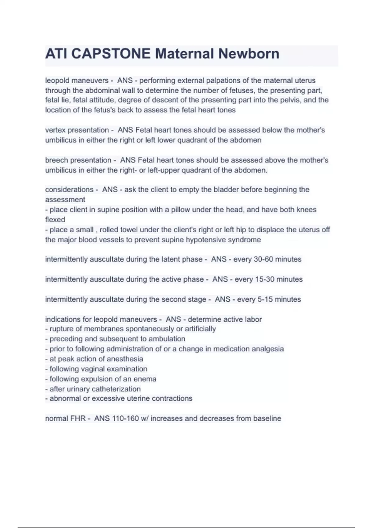leopold maneuvers - ANS - performing external palpations of the maternal uterus through the abdominal wall to determine the number of fetuses, the presenting part, fetal lie, fetal attitude, degree of descent of the presenting part into the pelvis, and the location of the fetus's back to assess the fetal heart tones vertex presentation - ANS Fetal heart tones should be assessed below the mother's umbilicus in either the right or left lower quadrant of the abdomen breech presentation - ANS Fetal heart tones should be assessed above the mother's umbilicus in either the right- or left-upper quadrant of the abdomen. considerations - ANS - ask the client to empty the bladder before beginning the assessment - place client in supine position with a pillow under the head, and have both knees flexed - place a small , rolled towel under the client's right or left hip to displace the uterus off the major blood vessels to prevent supine hypotensive syndrome intermittently auscultate during the latent phase - ANS - every 30-60 minutes intermittently auscultate during the active phase - ANS - every 15-30 minutes intermittently auscultate during the second stage - ANS - every 5-15 minutes indications for leopold maneuvers - ANS - determine active labor - rupture of membranes spontaneously or artificially - preceding and subsequent to ambulation - prior to following administration of or a change in medication analgesia - at peak action of anesthesia - following vaginal examination - following expulsion of an enema - after urinary catheterization - abnormal or excessive uterine contractions normal FHR - ANS 110-160 w/ increases and decreases from baseline continuous electronic fetal monitoring - ANS - accomplished by securing an ultrasound transducer over the clients abdomen, which records the FHR pattern and a tocotransducer on the fundus that records the uterine contraindications indications for electronic fetal monitoring - ANS - multiple gestations - oxytocin infusion - placenta previa - fetal bradycardia - maternal complications - intrauterine growth restriction - post-date gestation - active labor - meconium stained amniotic fluid - abruptio placentae - abnormal nonstress test or contraction stress test - abnormal uterine contractions - fetal distress Three Tier System - ANS - fetal monitoring system with FHR interpretation system - category 1 - ANS - baseline FHR of 110-160 /min - baseline FHR variability: moderate - accelerations present or absent - early decelerations: present or absent - variable/late decelerations: absent Category 2 - ANS - tracings include all FHR tracings not categorized as category 1 or 3. - baseline rate (tachycardia, bradycardia not accompanied by absent baseline variability)