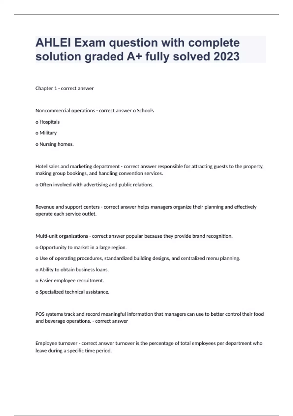 AHLEI Exam question with complete solution graded A+ fully solved 2023Chapter 1 - correct answer Noncommercial operations - correct answer o Schools o Hospitals o Military o Nursing homes. Hotel sales and marketing department - correct answer responsible for attracting guests to the property, making group bookings, and handling convention services. o Often involved with advertising and public relations. Revenue and support centers - correct answer helps managers organize their planning and effectively operate each service outlet. Multi-unit organizations - correct answer popular because they provide brand recognition. o Opportunity to market in a large region. o Use of operating procedures, standardized building designs, and centralized menu planning. o Ability to obtain business loans. o Easier employee recruitment. o Specialized technical assistance. POS systems track and record meaningful information that managers can use to better control their food and beverage operations. - correct answer Employee turnover - correct answer turnover is the percentage of total employees per department who leave during a specific time period.