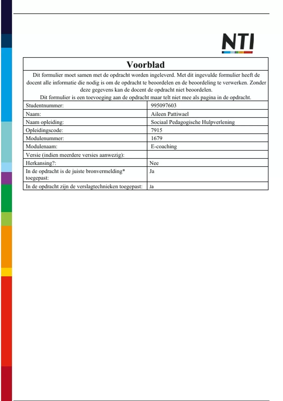 Dit formulier moet samen met de opdracht worden ingeleverd. Met dit ingevulde formulier heeft de