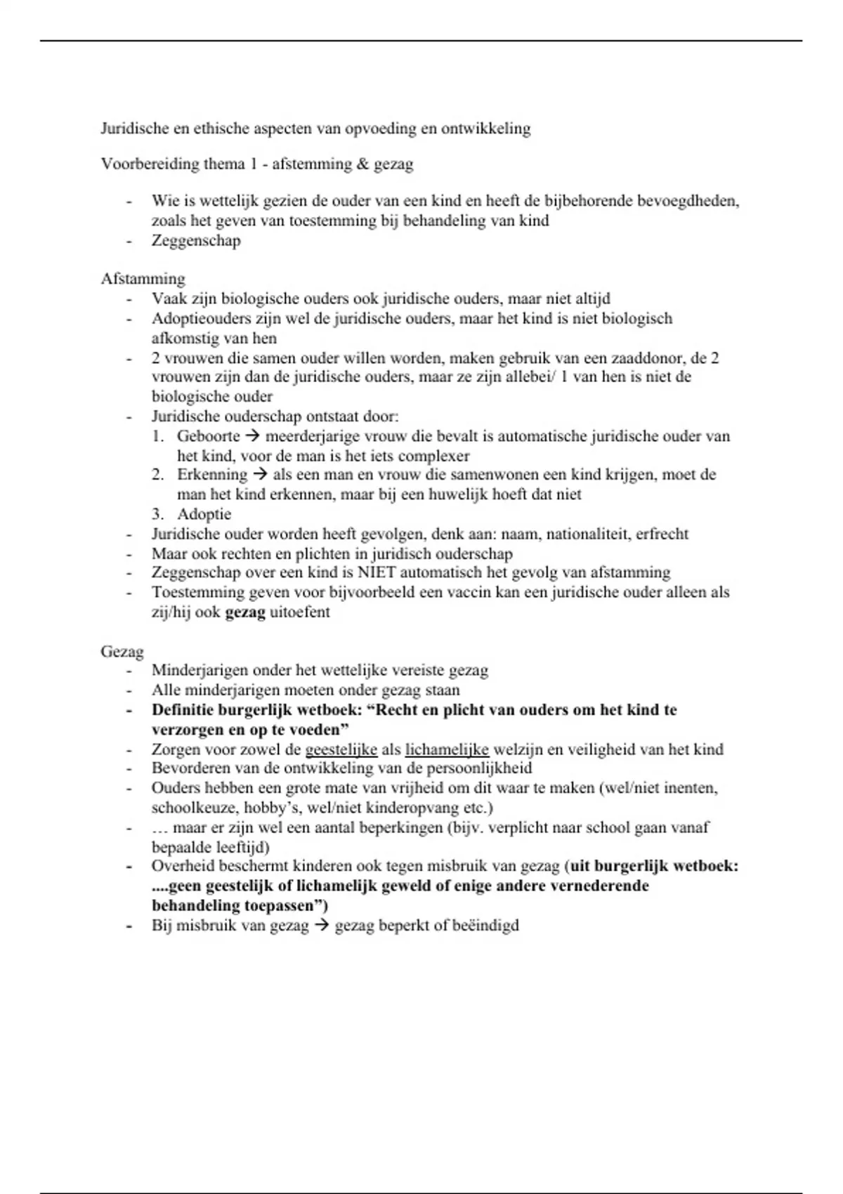 Samenvatting van de opgegeven literatuur van het vak juridische en ethische aspecten. Ook notes van de kaders per thema. Samenvatting van het boek Jeugdrecht Begrepen.