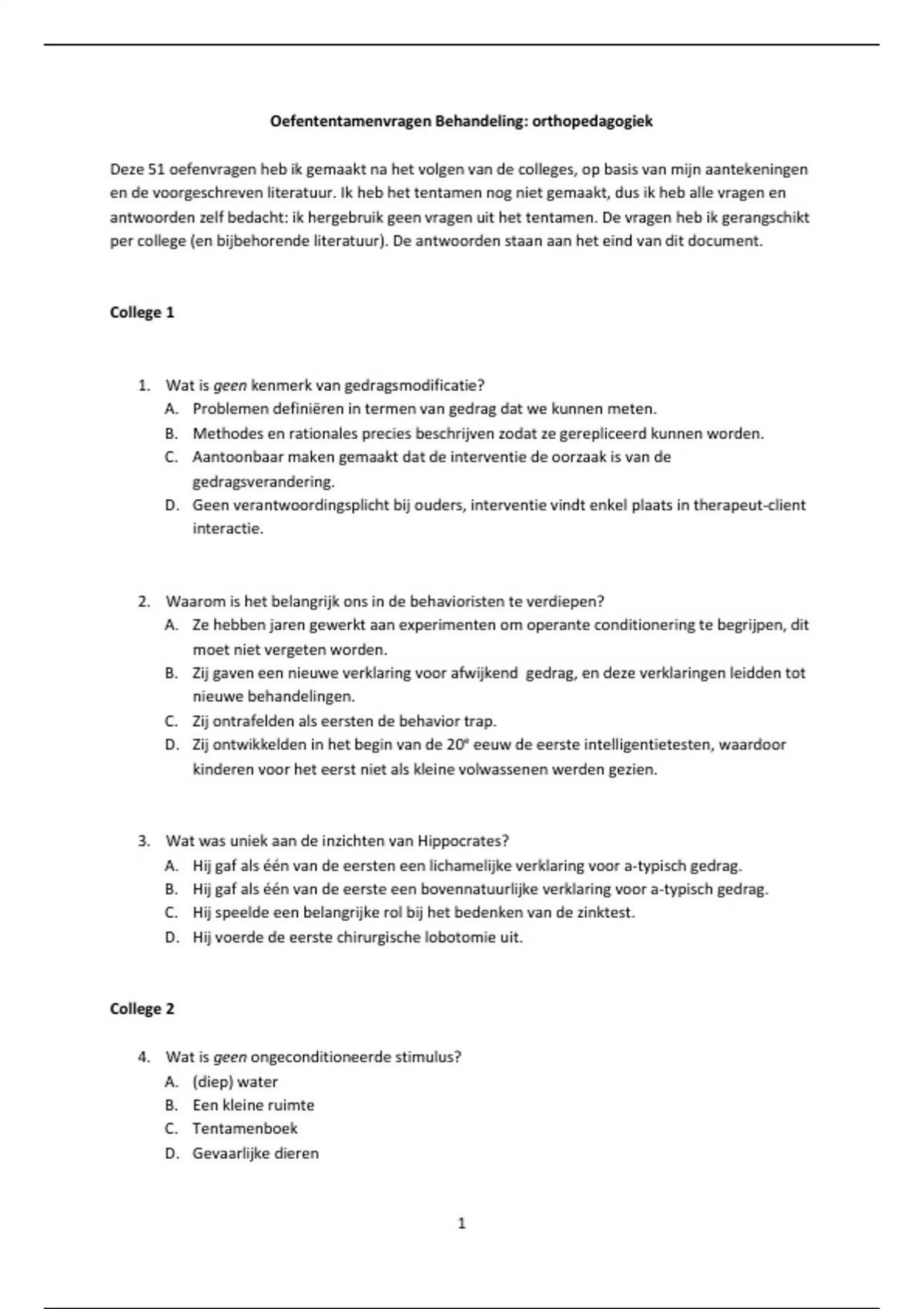 Dit document bevat 51 tentamenvragen voor het vak Behandeling: interventies binnen de orthopedagogiek van de opleiding Pedagogische Wetenschappe (orthopedagogiek) van de Universiteit Leiden. Het zijn oefententamenvragen, deze vragen heb ik zelf bedacht en komen dus niet uit eerdere tentamens.