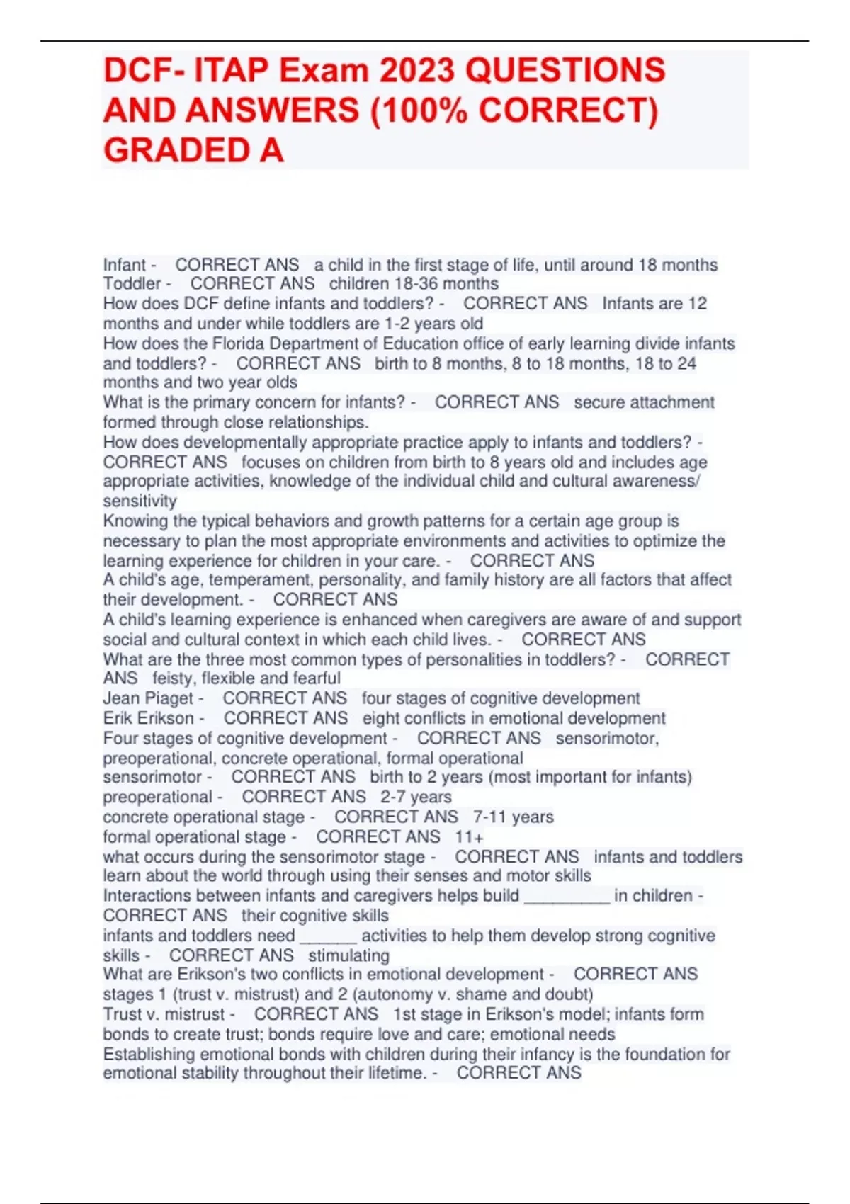 Infant - CORRECT ANS a child in the first stage of life, until around 18 months Toddler - CORRECT ANS children 18-36 months How does DCF define infants and toddlers? - CORRECT ANS Infants are 12 months and under while toddlers are 1-2 years old How does the Florida Department of Education office of early learning divide infants and toddlers? - CORRECT ANS birth to 8 months, 8 to 18 months, 18 to 24 months and two year olds What is the primary concern for infants? - CORRECT ANS secure attachment formed through close relationships. How does developmentally appropriate practice apply to infants and toddlers? - CORRECT ANS focuses on children from birth to 8 years old and includes age appropriate activities, knowledge of the individual child and cultural awareness/ sensitivity Knowing the typical behaviors and growth patterns for a certain age group is necessary to plan the most appropriate environments and activities to optimize the learning experience for children in your care. - CORRECT ANS A child's age, temperament, personality, and family history are all factors that affect their development. - CORRECT ANS A child's learning experience is enhanced when caregivers are aware of and support social and cultural context in which each child lives. - CORRECT ANS What are the three most common types of personalities in toddlers? - CORRECT ANS feisty, flexible and fearful Jean Piaget - CORRECT ANS four stages of cognitive development Erik Erikson - CORRECT ANS eight conflicts in emotional development Four stages of cognitive development - CORRECT ANS sensorimotor, preoperational, concrete operational, formal operational sensorimotor - CORRECT ANS birth to 2 years (most important for infants) preoperational - CORRECT ANS 2-7 years concrete operational stage - CORRECT ANS 7-11 years formal operational stage - CORRECT ANS 11+ what occurs during the sensorimotor stage - CORRECT ANS infants and toddlers learn about the world through using their senses and motor skills Interactions between infants and caregivers helps build _________ in children - CORRECT ANS their cognitive skills infants and toddlers need ______ activities to help them develop strong cognitive skills - CORRECT ANS stimulating What are Erikson's two conflicts in emotional development - CORRECT ANS stages 1 (trust v. mistrust) and 2 (autonomy v. shame and doubt) Trust v. mistrust - CORRECT ANS 1st stage in Erikson's model; infants form bonds to create trust; bonds require love and care; emotional needs Establishing emotional bonds with children during their infancy is the foundation for emotional stability throughout their lifetime. - CORRECT ANS DCF- ITAP Exam 2023 QUESTIONS AND ANSWERS (100% CORRECT) GRADED A Autonmoy vs. Shame and Doubt - CORRECT ANS second stage; children need to become independent and learn to problem solve in order to strengthen emotional security later in life list the 8 areas of development - CORRECT ANS 1. physical 2. approaches to learning 3. social and emotional development