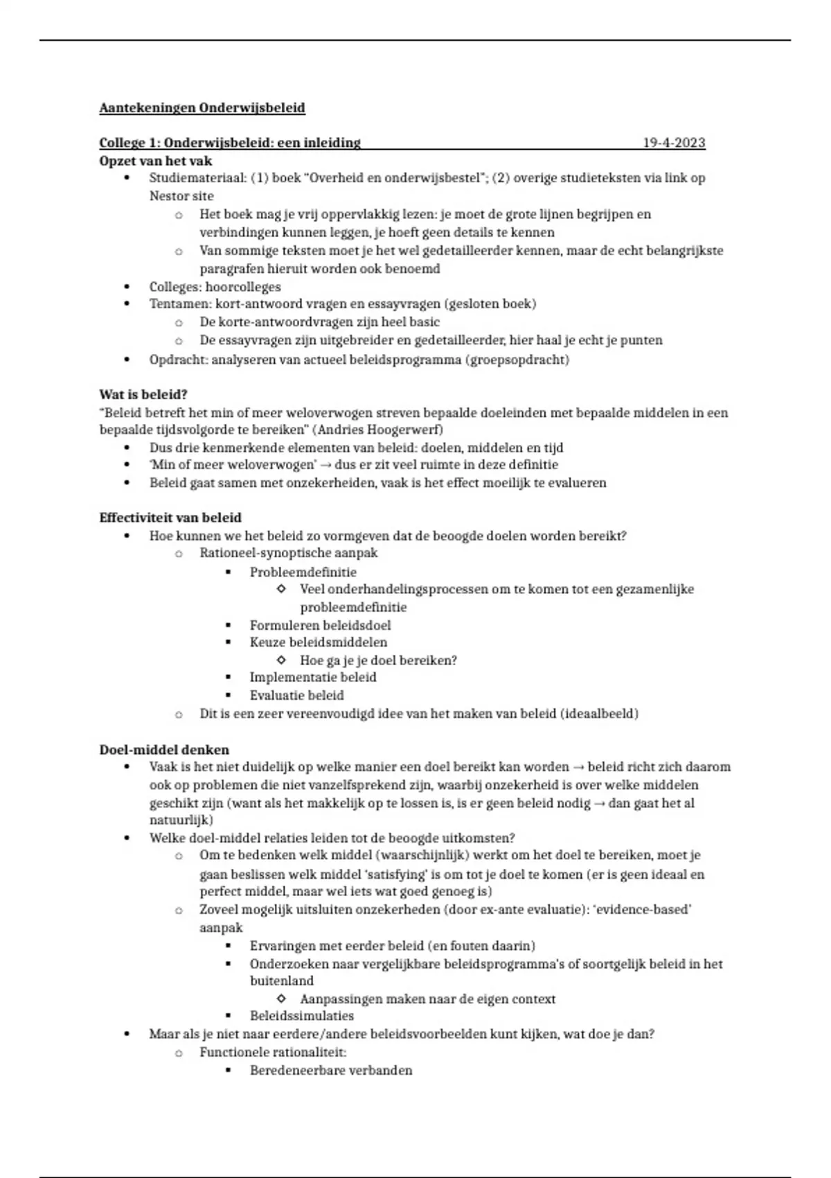 Dit zijn duidelijke, overzichtelijke collegeaantekeningen van het vak Onderwijsbeleid uit de master Onderwijsinnovatie, gegeven in collegejaar 2022/2023.