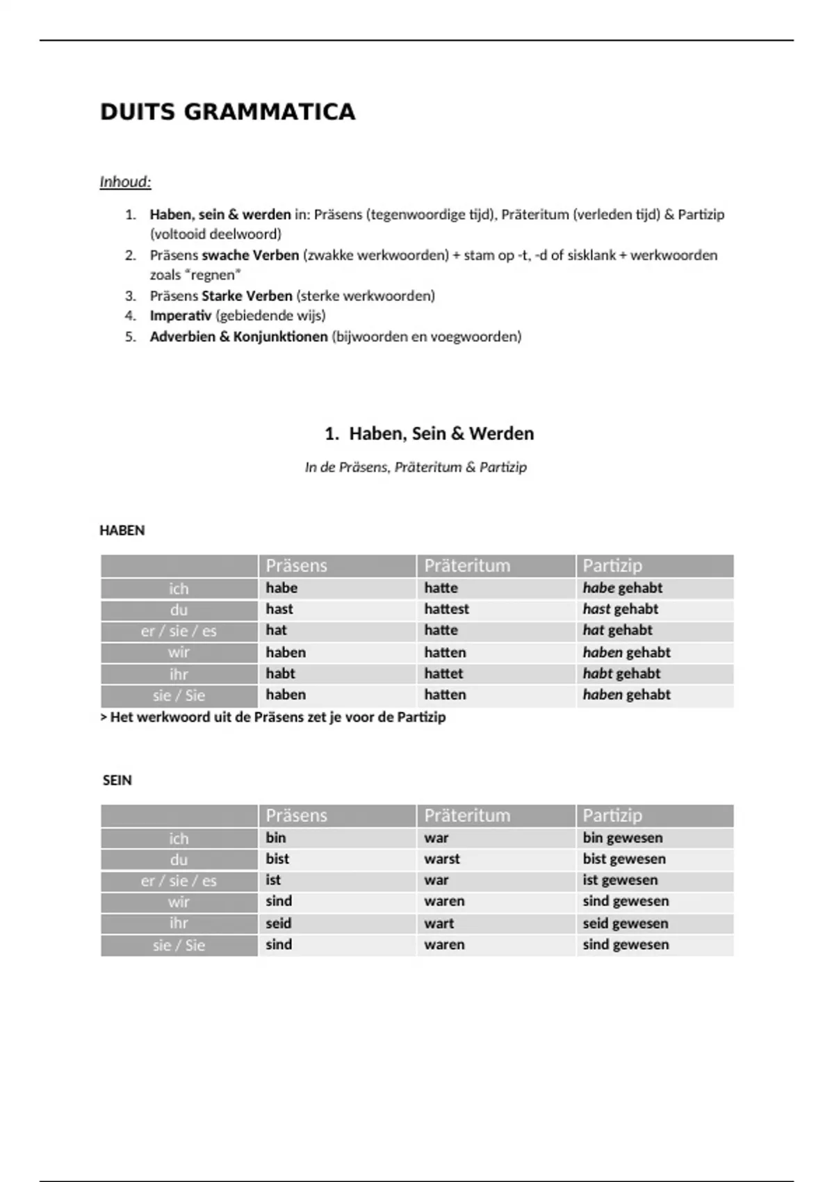 1. Haben, sein & werden in: Präsens (tegenwoordige tijd), Präteritum (verleden tijd) & Partizip
