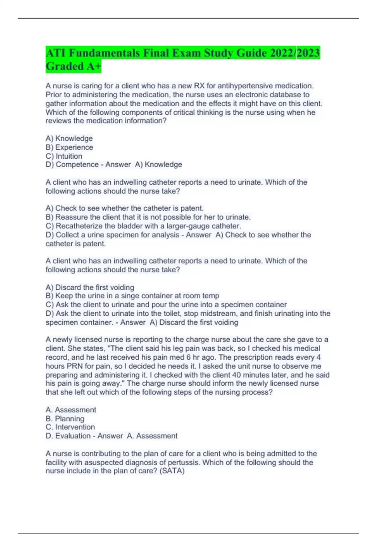 ATI Fundamentals Final Exam Study Guide 2022/2023 Graded A+ A nurse is caring for a client who has a new RX for antihypertensive medication. Prior to administering the medication, the nurse uses an electronic database to gather information about the medication and the effects it might have on this client. Which of the following components of critical thinking is the nurse using when he reviews the medication information? A) Knowledge B) Experience C) Intuition D) Competence - Answer A) Knowledge A client who has an indwelling catheter reports a need to urinate. Which of the following actions should the nurse take? A) Check to see whether the catheter is patent. B) Reassure the client that it is not possible for her to urinate. C) Recatheterize the bladder with a larger-gauge catheter. D) Collect a urine specimen for analysis - Answer A) Check to see whether the catheter is patent. A client who has an indwelling catheter reports a need to urinate. Which of the following actions should the nurse take? A) Discard the first voiding B) Keep the urine in a singe container at room temp C) Ask the client to urinate and pour the urine into a specimen container D) Ask the client to urinate into the toilet, stop midstream, and finish urinating into the specimen container. - Answer A) Discard the first voiding A newly licensed nurse is reporting to the charge nurse about the care she gave to a client. She states, "The client said his leg pain was back, so I checked his medical record, and he last received his pain med 6 hr ago. The prescription reads every 4 hours PRN for pain, so I decided he needs it. I asked the unit nurse to observe me preparing and administering it. I checked with the client 40 minutes later, and he said his pain is going away." The charge nurse should inform the newly licensed nurse that she left out which of the following steps of the nursing process? A. Assessment B. Planning C. Intervention D. Evaluation - Answer A. Assessment A nurse is contributing to the plan of care for a client who is being admitted to the facility with asuspected diagnosis of pertussis. Which of the following should the nurse include in the plan of care? (SATA)