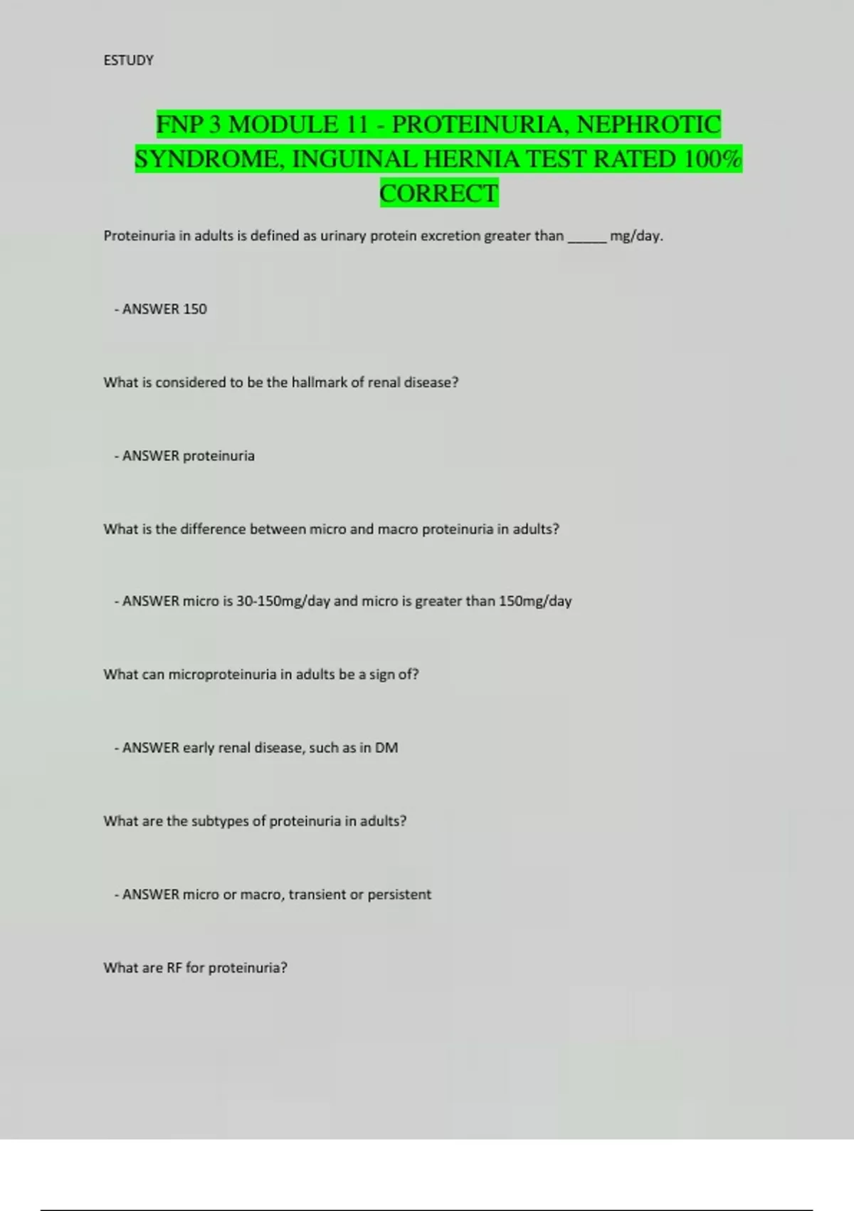 FNP 3 MODULE 11 - PROTEINURIA, NEPHROTIC SYNDROME, INGUINAL HERNIA TEST RATED 100% CORRECT
