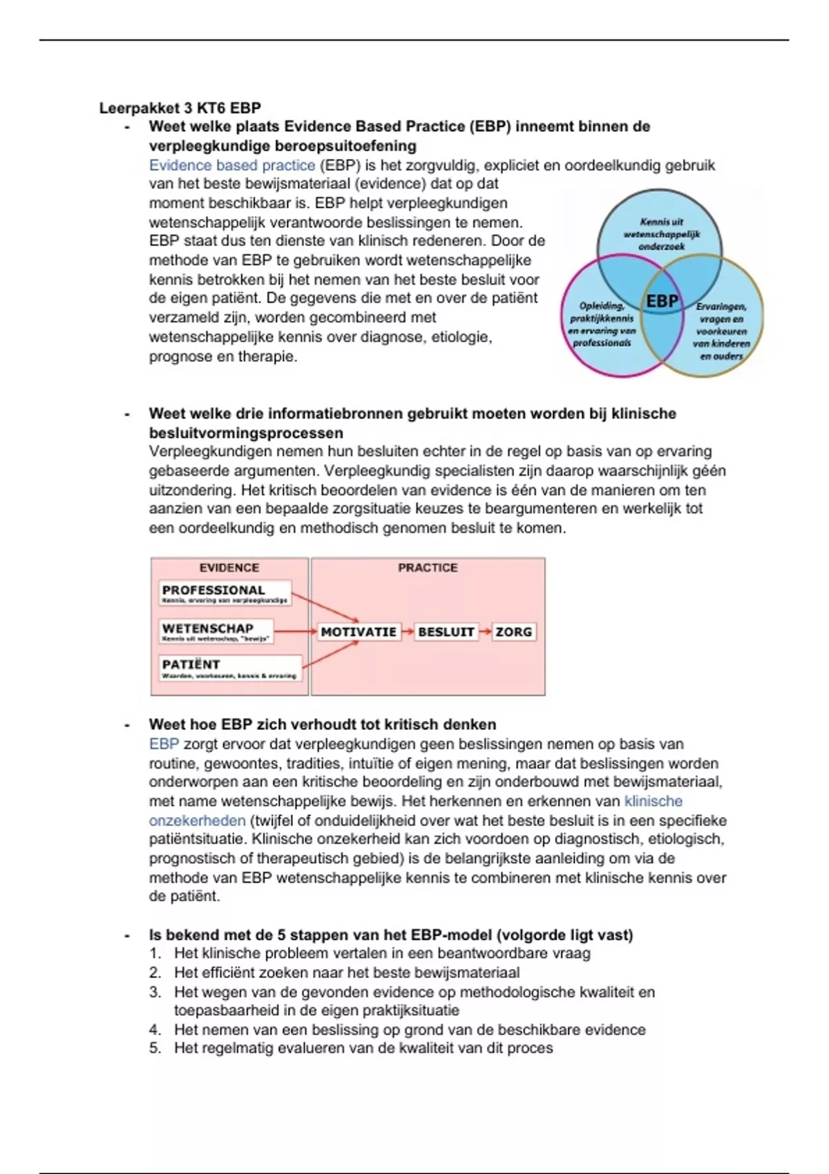 - Is bekend met de 5 stappen van het EBP-model (volgorde ligt vast)