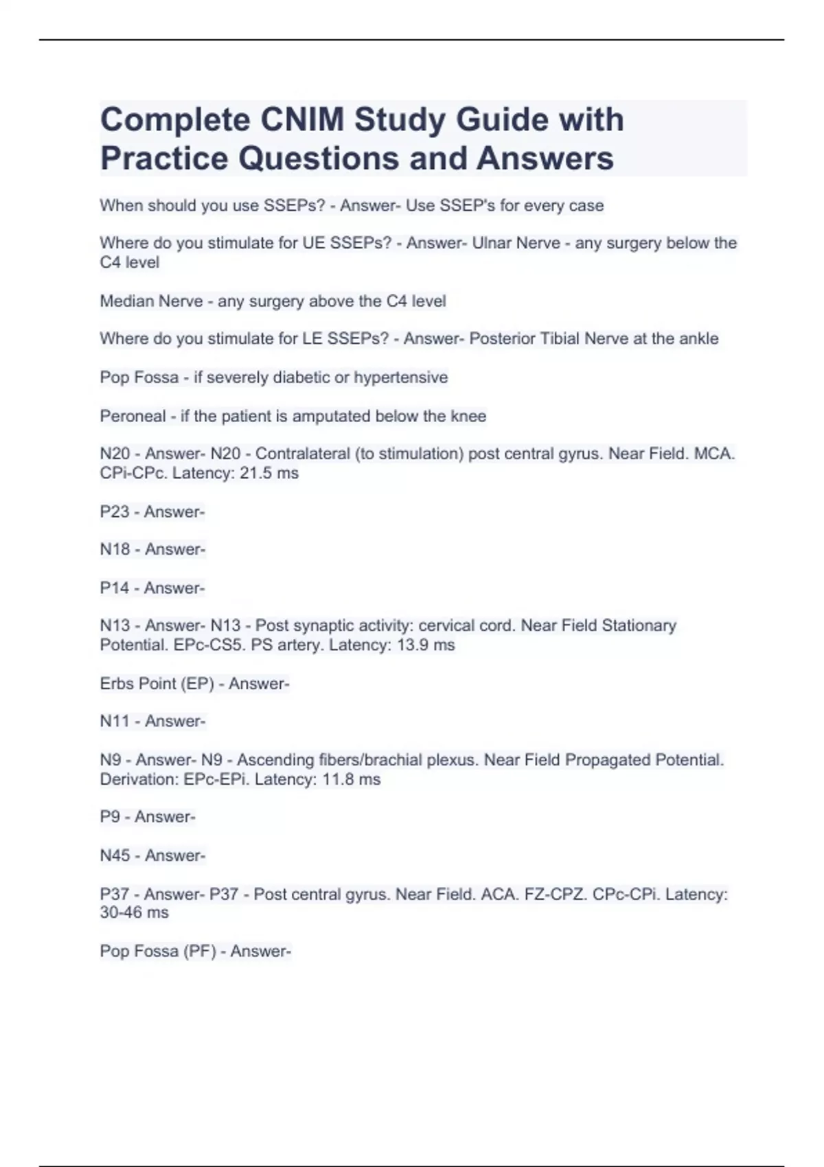 When should you use SSEPs? - Answer- Use SSEP's for every case Where do you stimulate for UE SSEPs? - Answer- Ulnar Nerve - any surgery below the C4 level Median Nerve - any surgery above the C4 level Where do you stimulate for LE SSEPs? - Answer- Posterior Tibial Nerve at the ankle Pop Fossa - if severely diabetic or hypertensive Peroneal - if the patient is amputated below the knee N20 - Answer- N20 - Contralateral (to stimulation) post central gyrus. Near Field. MCA. CPi-CPc. Latency: 21.5 ms P23 - Answer- N18 - Answer- P14 - Answer- N13 - Answer- N13 - Post synaptic activity: cervical cord. Near Field Stationary Potential. EPc-CS5. PS artery. Latency: 13.9 ms Erbs Point (EP) - Answer- N11 - Answer- N9 - Answer- N9 - Ascending fibers/brachial plexus. Near Field Propagated Potential. Derivation: EPc-EPi. Latency: 11.8 ms P9 - Answer- N45 - Answer- P37 - Answer- P37 - Post central gyrus. Near Field. ACA. FZ-CPZ. CPc-CPi. Latency: 30-46 ms Pop Fossa (PF) - Answer- Stimulus intensity for SSEP - Answer- sufficient to cause a slight muscle twitch, higher used in atrophied limbs (higher intensity is painful and recruit motor >sensory responses). Stimulus rate in SSEP - Answer- 2-5 Hz for upper extremity stimulation and 1-2 Hz for lower extremity stimulation (rates greater than 10 Hz may cause an increase in latency and decrease in amplitude). Filter Setting in SSEP - Answer- 30-3000 Hz. (Not recommended to use the 60 Hz notch filter because SSEP in this range contains important physiologic information). Pulse width in SSEP - Answer- 100-300 µs Analysis time in SSEP - Answer- 40 ms for UE and 60 ms for LE. Amplifier sensitivity in SSEP - Answer- 10 µV for the spine and scalp potentials and 20 µV for peripheral potentials. Number averaged in SSEP (trials) - Answer- 500-2000 for reproducible wave forms (depends on noise). Electrode impedance - Answer- <5000 Ω SSEP Montage for UE recording - Answer- Channel 4: CPc-CPi > Cortical (N20) Channel 3: CPi-REF > Subcortical farfield (P14 [caudal medial lemniscus], N18 [thalamus]) Channel 2: C5S-REF > Stationary postsynaptic cervical (N13) Channel 1: EPi-REF > Past Erb's point (Ep) SSEP Montage for LE recording - Answer- Channel 4: CPi-Fpz > Cortical (P37) Channel 3: CPz-Fpz > Cortical (P37) Channel 2: EPz-C5S > Subcortical P31 and N34 (C5S is relatively inactive so good REF) Channel 1: T12-REF > Stationary lumbar potential (LP). System bandpass for SSEP - Answer- The recording bandpass is typically 30 - 1 kHz (-3db). The same considerations apply as for upper extremity SSEPs. When should you use spontaneous EMG (free run EMG, sEMG)? - Answer- In any surgery when there is possible nerve root compromise