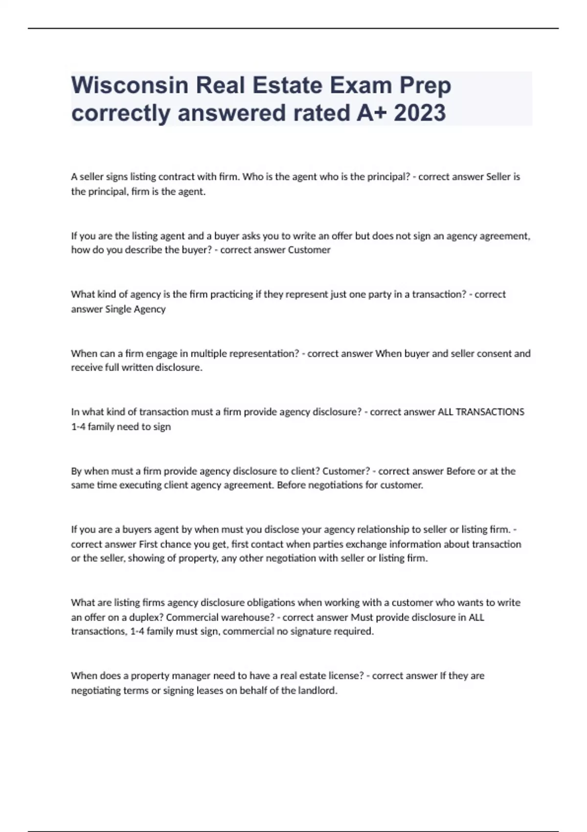 Wisconsin Real Estate Exam Prep correctly answered rated A+ 2023A seller signs listing contract with firm. Who is the agent who is the principal? - correct answer Seller is the principal, firm is the agent. If you are the listing agent and a buyer asks you to write an offer but does not sign an agency agreement, how do you describe the buyer? - correct answer Customer What kind of agency is the firm practicing if they represent just one party in a transaction? - correct answer Single Agency When can a firm engage in multiple representation? - correct answer When buyer and seller consent and receive full written disclosure. In what kind of transaction must a firm provide agency disclosure? - correct answer ALL TRANSACTIONS 1-4 family need to sign By when must a firm provide agency disclosure to client? Customer? - correct answer Before or at the same time executing client agency agreement. Before negotiations for customer. If you are a buyers agent by when must you disclose your agency relationship to seller or listing firm. - correct answer First chance you get, first contact when parties exchange information about transaction or the seller, showing of property, any other negotiation with seller or listing firm. What are listing firms agency disclosure obligations when working with a customer who wants to write an offer on a duplex? Commercial warehouse? - correct answer Must provide disclosure in ALL transactions, 1-4 family must sign, commercial no signature required. When does a property manager need to have a real estate license? - correct answer If they are negotiating terms or signing leases on behalf of the landlord.