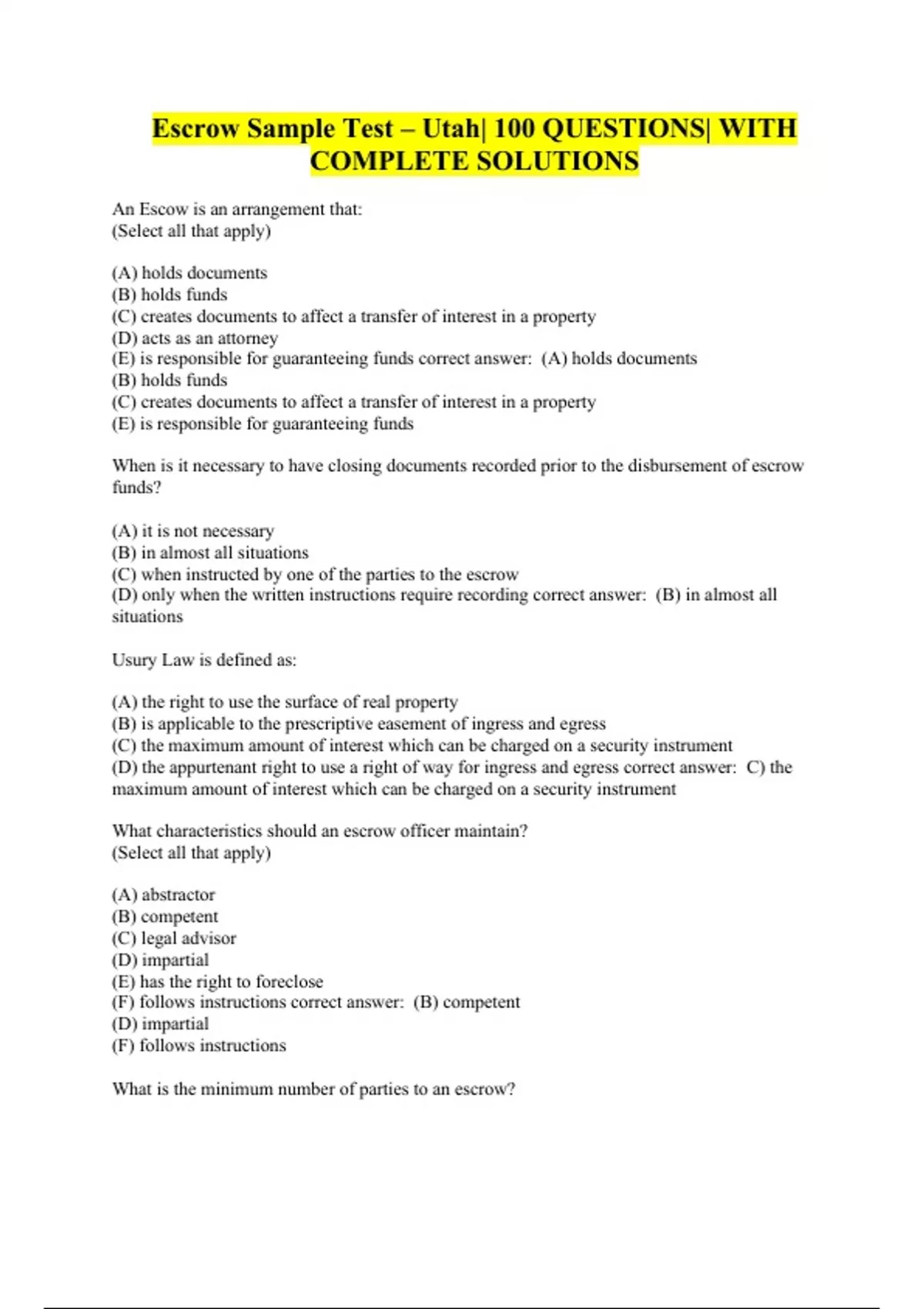 Escrow Sample Test – Utah| 100 QUESTIONS| WITH COMPLETE SOLUTIONS. An Escow is an arrangement that: (Select all that apply) (A) holds documents (B) holds funds (C) creates documents to affect a transfer of interest in a property (D) acts as an attorney (E) is responsible for guaranteeing funds correct answer: (A) holds documents (B) holds funds (C) creates documents to affect a transfer of interest in a property (E) is responsible for guaranteeing funds When is it necessary to have closing documents recorded prior to the disbursement of escrow funds? (A) it is not necessary (B) in almost all situations (C) when instructed by one of the parties to the escrow (D) only when the written instructions require recording correct answer: (B) in almost all situations Usury Law is defined as: (A) the right to use the surface of real property (B) is applicable to the prescriptive easement of ingress and egress (C) the maximum amount of interest which can be charged on a security instrument (D) the appurtenant right to use a right of way for ingress and egress correct answer: C) the maximum amount of interest which can be charged on a security instrument What characteristics should an escrow officer maintain? (Select all that apply) (A) abstractor (B) competent (C) legal advisor (D) impartial (E) has the right to foreclose (F) follows instructions correct answer: (B) competent (D) impartial (F) follows instructions What is the minimum number of parties to an escrow? (A) two (B) three (C) four (D) five correct answer: (B) three An Earnest Money Agreement (REPC) usually does not reveal the following: (A) property address (B) buyers' and seller's name (C) title exceptions (D) improvements to the subject property (E) personal property to be included in the sale correct answer: (C) title exceptions An escrow agent has the responsibility to review the following, with parties involved in a real estate transaction: (A) the Title Report (B) The Earnest Money Agreement (REPC) (C) The Owner's Policy (D) Certificate of Apportionment (E) Letters of Testamentary correct answer: (A) the Title Report What is a Bill of Sale? (A) same as a warranty deed (B) instrument to transfer mineral rights (C) used to convey personal property (D) a certificate concerning well rights (E) instrument to convey a title policy correct answer: (C) used to convey personal property.