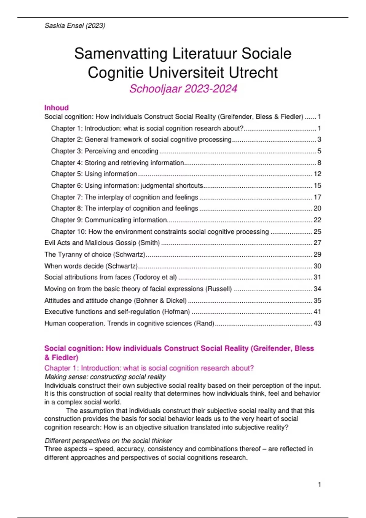 Samenvatting Literatuur (boek & artikelen) van Sociale Cognitie (UU)