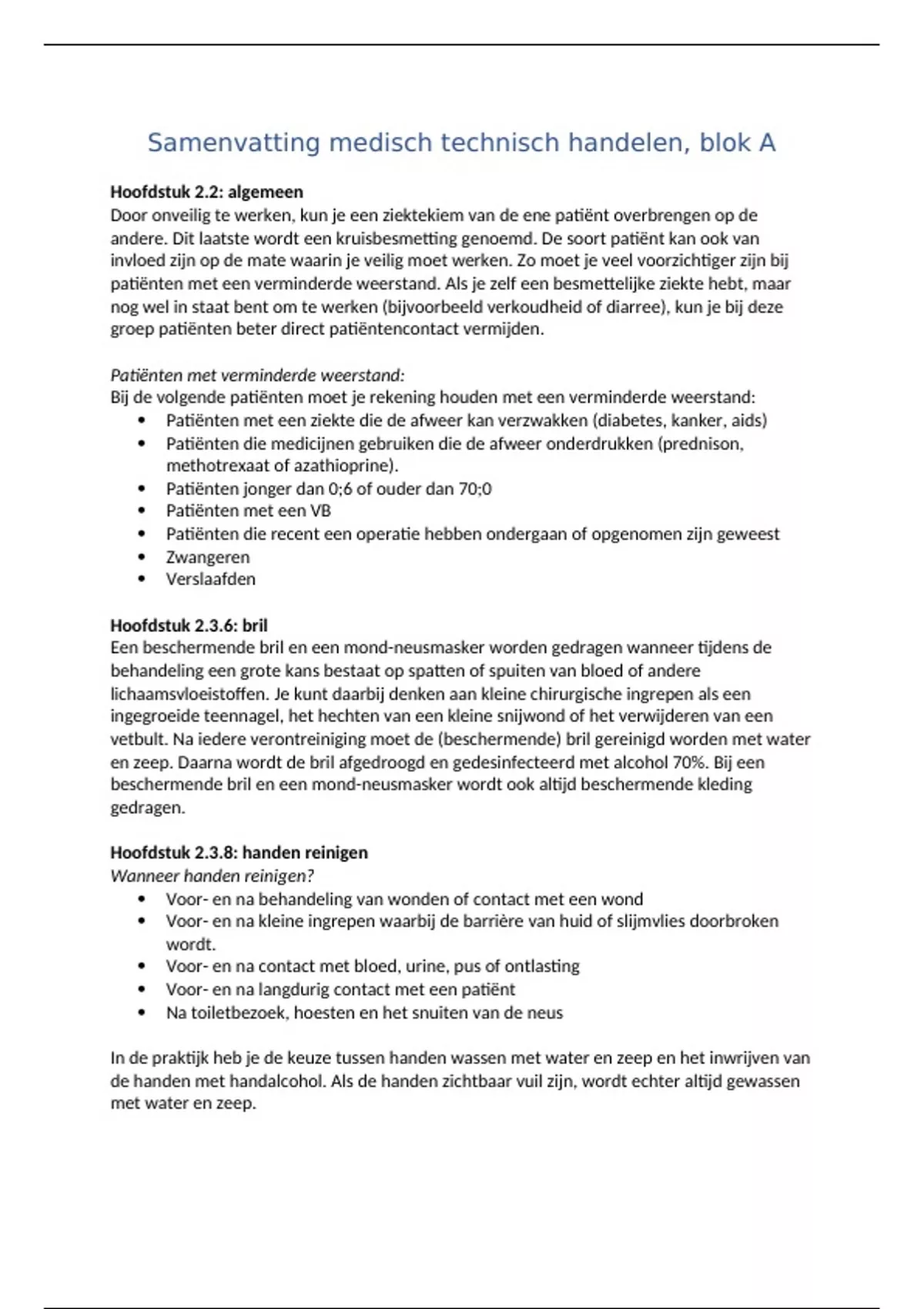 Dit document bevat een samenvatting van de gevraagde theorie voor het vak medisch technisch handelen blok A. Daarnaast bevat het ook aantekeningen welke gemaakt zijn tijdens de lessen en een overzicht voor de instrumententoets
