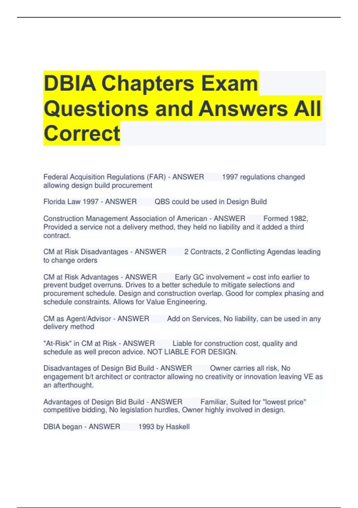 DBIA Chapters Exam Questions and Answers All Correct Federal Acquisition Regulations (FAR) - ANSWER 1997 regulations changed allowing design build procurement Florida Law 1997 - ANSWER QBS could be used in Design Build Construction Management Association of American - ANSWER Formed 1982, Provided a service not a delivery method, they held no liability and it added a third contract. CM at Risk Disadvantages - ANSWER 2 Contracts, 2 Conflicting Agendas leading to change orders CM at Risk Advantages - ANSWER Early GC involvement = cost info earlier to prevent budget overruns. Drives to a better schedule to mitigate selections and procurement schedule. Design and construction overlap. Good for complex phasing and schedule constraints. Allows for Value Engineering. CM as Agent/Advisor - ANSWER Add on Services, No liability, can be used in any delivery method "At-Risk" in CM at Risk - ANSWER Liable for construction cost, quality and schedule as well precon advice. NOT LIABLE FOR DESIGN. Disadvantages of Design Bid Build - ANSWER Owner carries all risk, No engagement b/t architect or contractor allowing no creativity or innovation leaving VE as an afterthought. Advantages of Design Bid Build - ANSWER Familiar, Suited for "lowest price" competitive bidding, No legislation hurdles, Owner highly involved in design. DBIA began - ANSWER 1993 by Haskell