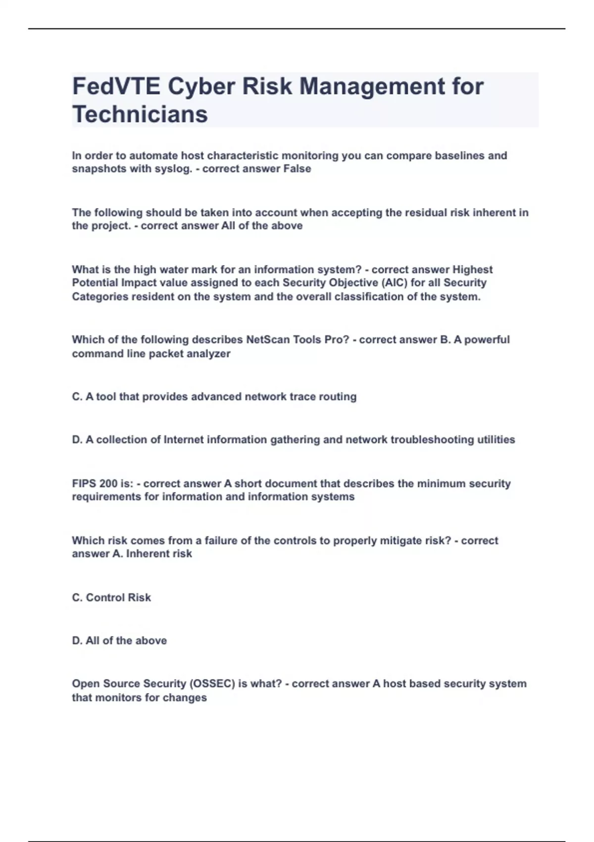 In order to automate host characteristic monitoring you can compare baselines and snapshots with syslog. False The following should be taken into account when accepting the residual risk inherent in the project. All of the above What is the high water mark for an information system? Highest Potential Impact value assigned to each Security Objective (AIC) for all Security Categories resident on the system and the overall classification of the system. Which of the following describes NetScan Tools Pro? B. A powerful command line packet analyzer C. A tool that provides advanced network trace routing D. A collection of Internet information gathering and network troubleshooting utilities FIPS 200 is: A short document that describes the minimum security requirements for information and information systems Which risk comes from a failure of the controls to properly mitigate risk? A. Inherent risk C. Control Risk D. All of the above Open Source Security (OSSEC) is what? A host based security system that monitors for changes What tool would be best to automatically detect your network and construct a complete and easy to view network map? LANsurveyor Which NIST special publication is a guide for Applying the Risk Management Framework to Federal Information Systems: A Security Life Cycle Approach? NIST SP 800 37 Which of the following is a part of the Examine Method? Inspecting the physical security measures If the cost of controls exceeds the benefit the organization may choose to accept the risk instead. True Which of the following families of controls belongs to the technical class of controls? Identification and Authentication Which tier of Risk Management is associated with Enterprise Architecture? Tier 2 Mission (Business Process) In NIST SP 800 53 the security control structure consists of all the following components except for: All of these are in the security control structure: - Priority and baseline allocation - Supplemental guidance - Control enhancements Kismet is different from a normal network sniffer such as Wireshark or tcpdump because it separates and identifies different wireless networks in the area. True What is the order of the Change Control Process? A. Request : Approval : Build : Impact Assessment : If successful Implement B. Request : Impact Assessment : Approval : Build and or Test : Implement D. Request : Impact Assessment : Build and or Test : Approval : Implement The threat source is highly motivated and sufficiently capable and controls to prevent the vulnerability from being exercised are ineffective. Which likelihood rating does this describe? High Which of the following is not part of the process for assessing security controls according to NIST SP 800 53A 1? A. Study C. Conduct D. Analyze Which step of a risk assessment uses the history of system attacks? Step 2: Threat Identification